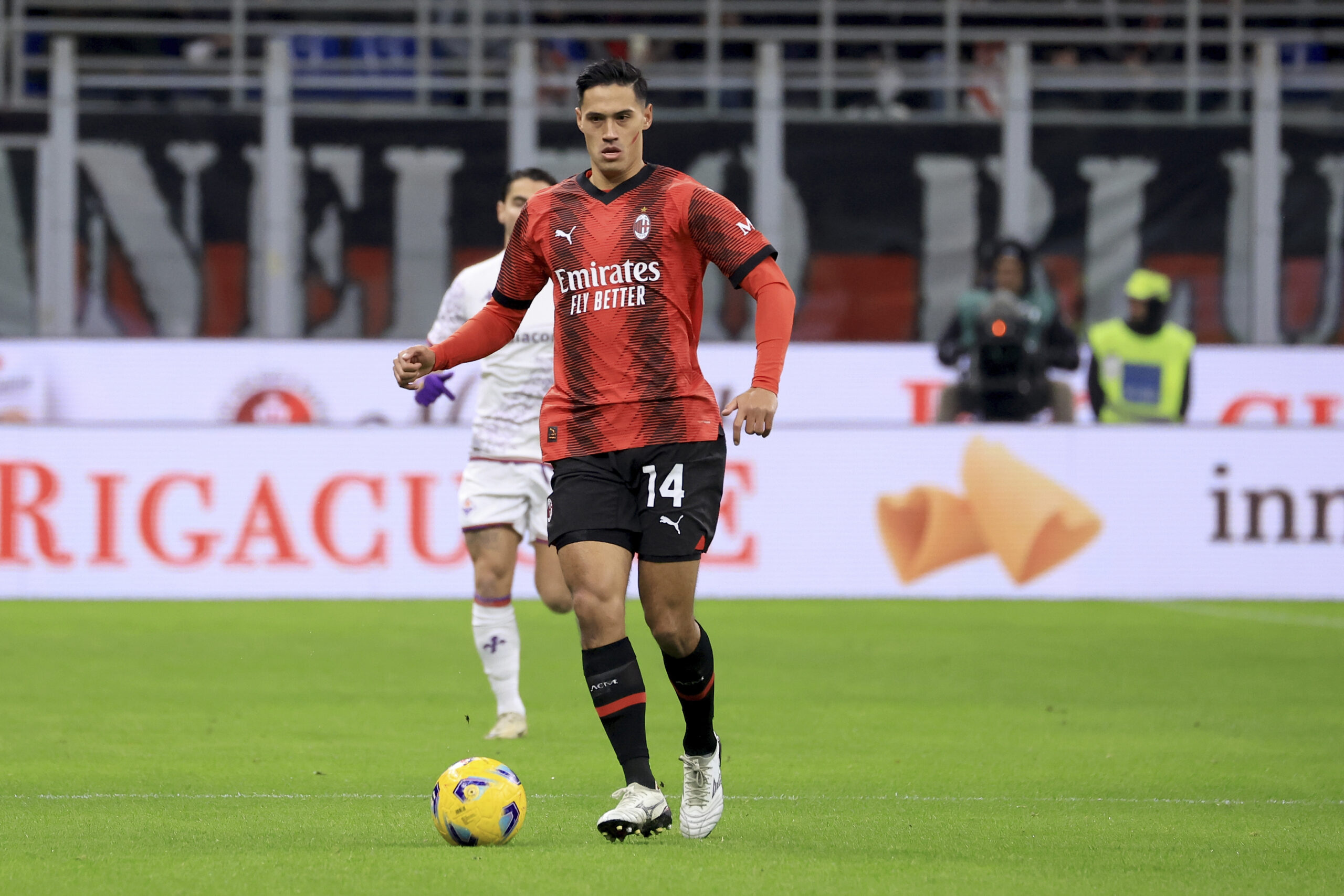 MILAN, ITALY - NOVEMBER 25: Tijjani Reijnders of AC Milan in action during the Serie A TIM match between AC Milan and ACF Fiorentina at Stadio Giuseppe Meazza on November 25, 2023 in Milan, Italy. (Photo by Giuseppe Cottini/AC Milan via Getty Images )
