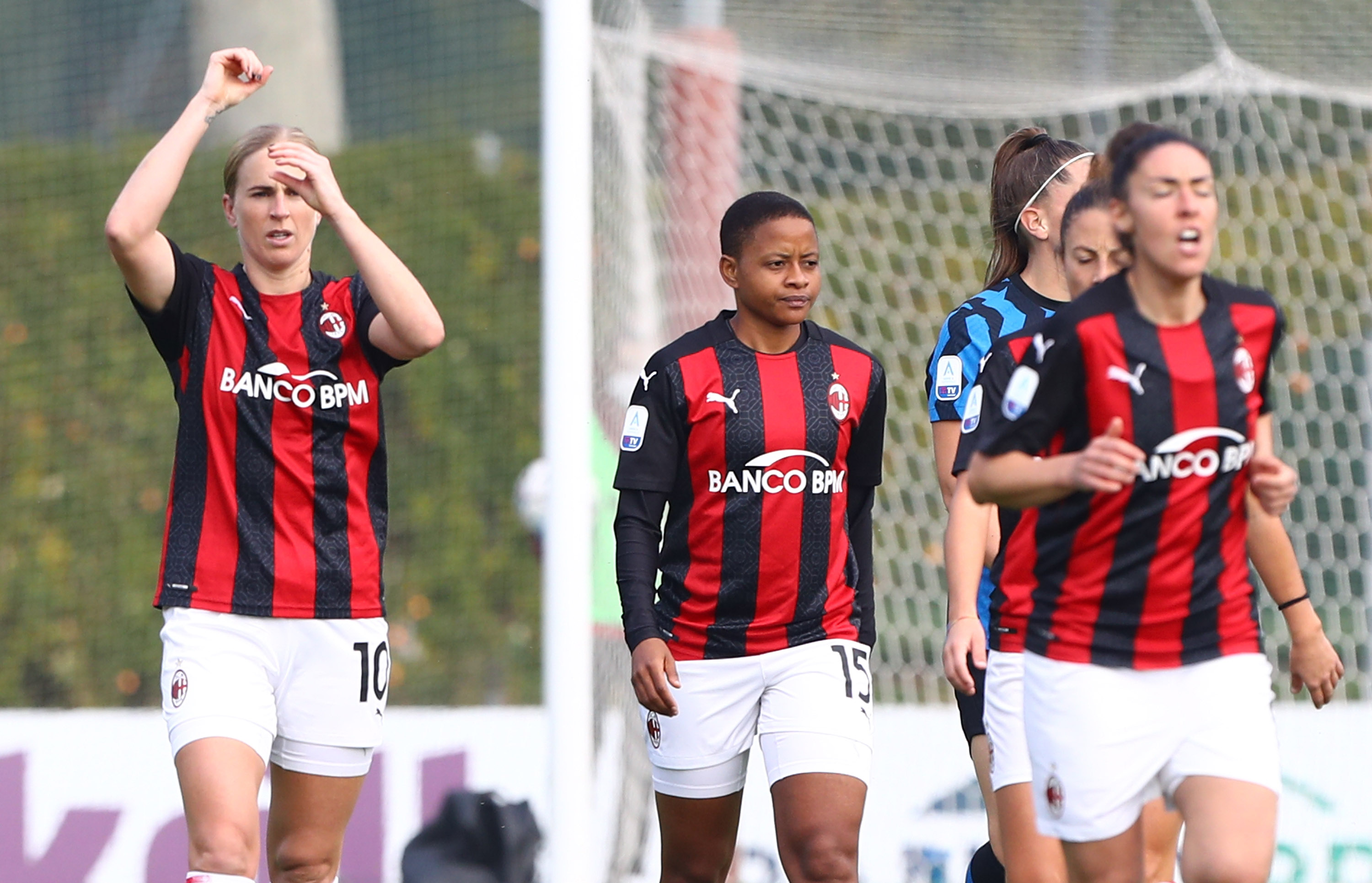 MILAN, ITALY - OCTOBER 18: Natasha Dowie (L) of AC Milan celebrates after scoring the opening goal during the Women Serie A match between AC Milan and FC Internazionale at Centro Sportivo Vismara on October 18, 2020 in Milan, Italy. (Photo by Marco Luzzani/Getty Images)