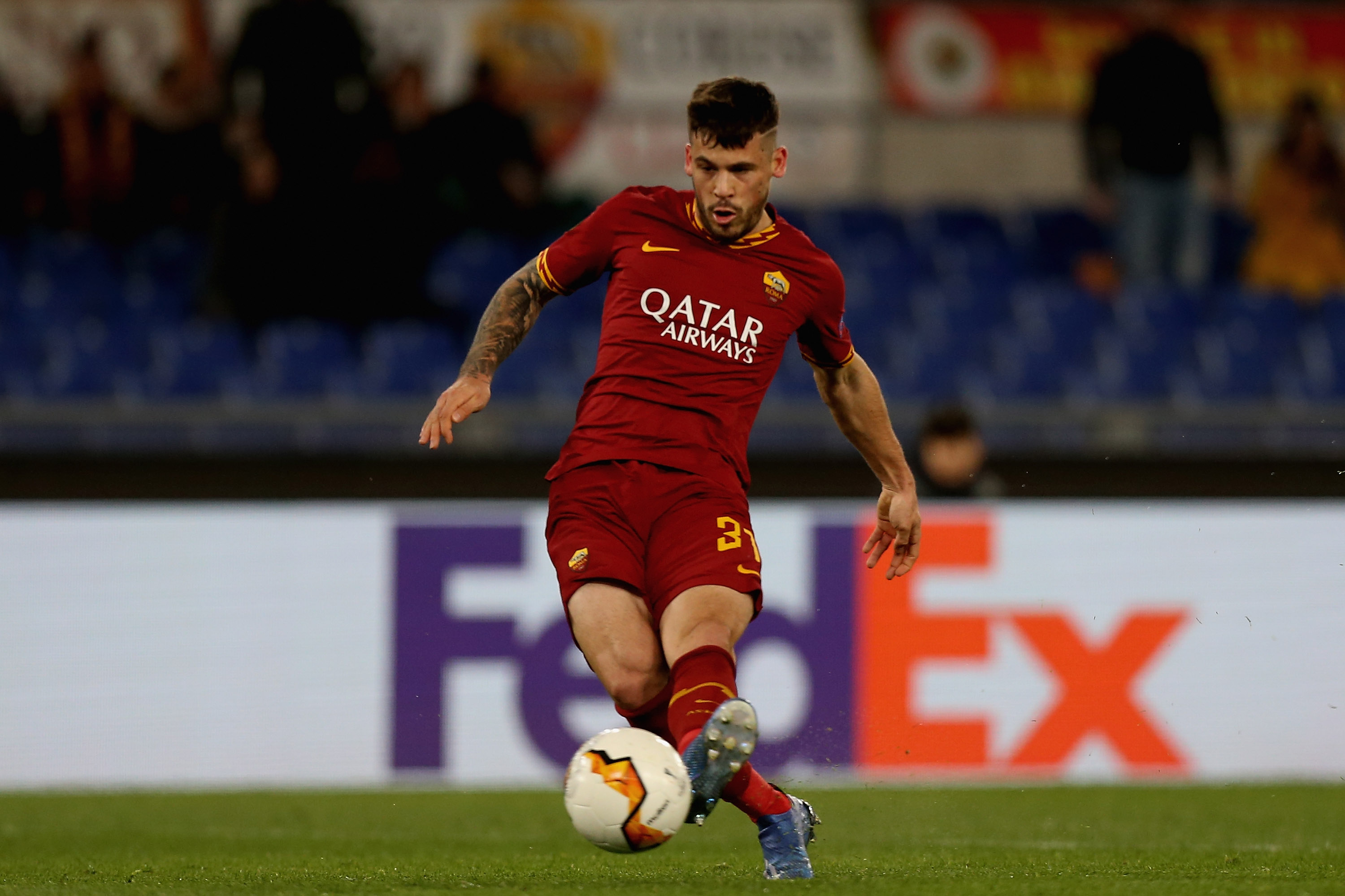 ROME, ITALY - FEBRUARY 20: Carles Perez of AS Roma scores the opening goal during the UEFA Europa League round of 32 first leg match between AS Roma and KAA Gent at Stadio Olimpico on February 20, 2020 in Rome, Italy. (Photo by Paolo Bruno/Getty Images)