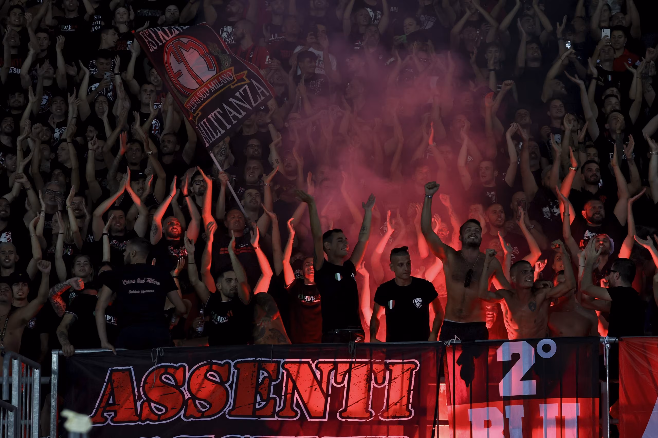 BERGAMO, ITALY - AUGUST 21: Fans of AC Milan attend during the Serie A match between Atalanta BC and AC Milan at Gewiss Stadium on August 21, 2022 in Bergamo, Italy. (Photo by Giuseppe Cottini/Getty Images)