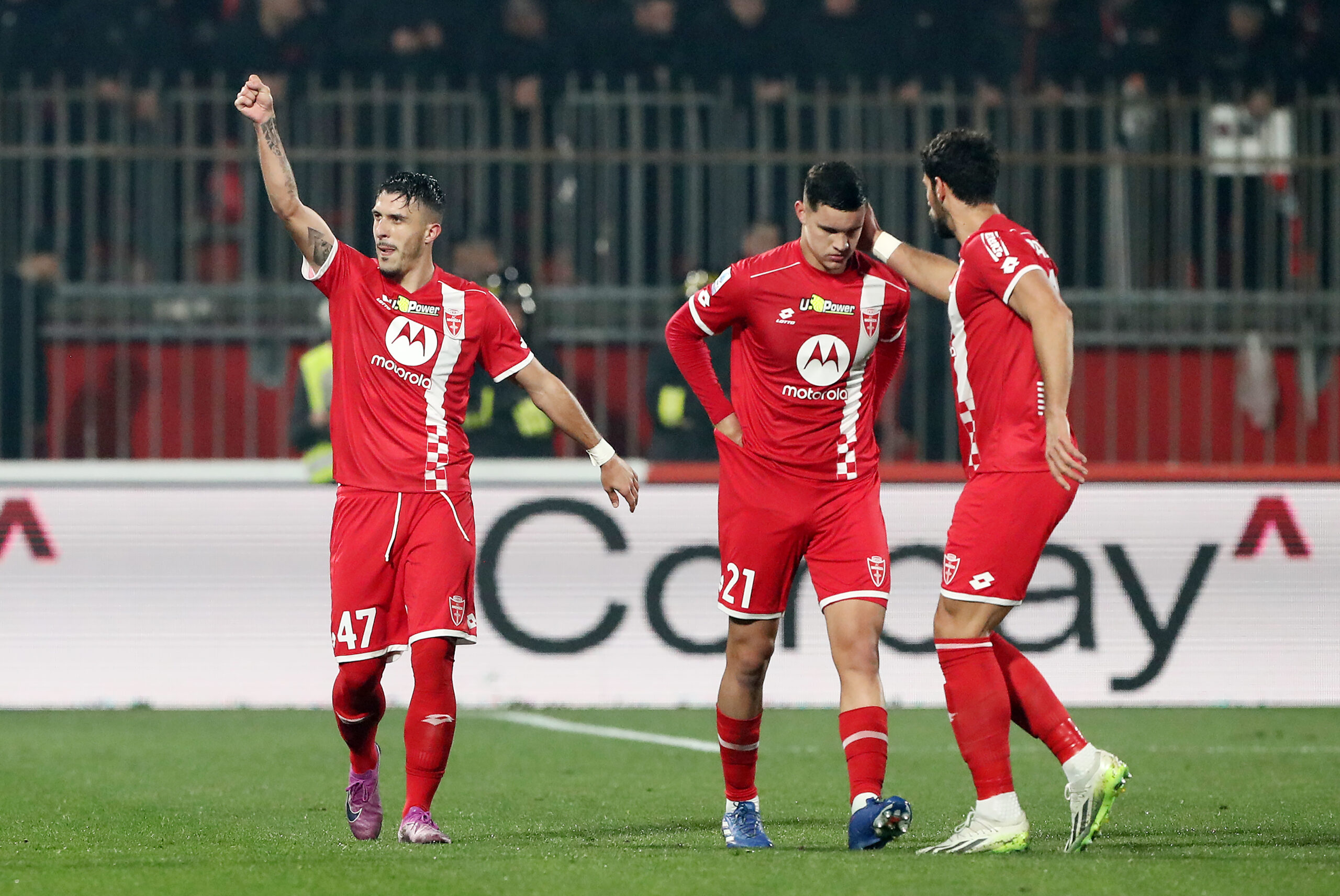 MONZA, ITALY - FEBRUARY 18: Dany Mota of AC Monza celebrates scoring his team's second goal with teammates Valentin Carboni and Pablo Mari during the Serie A TIM match between AC Monza and AC Milan - Serie A TIM at U-Power Stadium on February 18, 2024 in Monza, Italy. (Photo by Marco Luzzani/Getty Images)