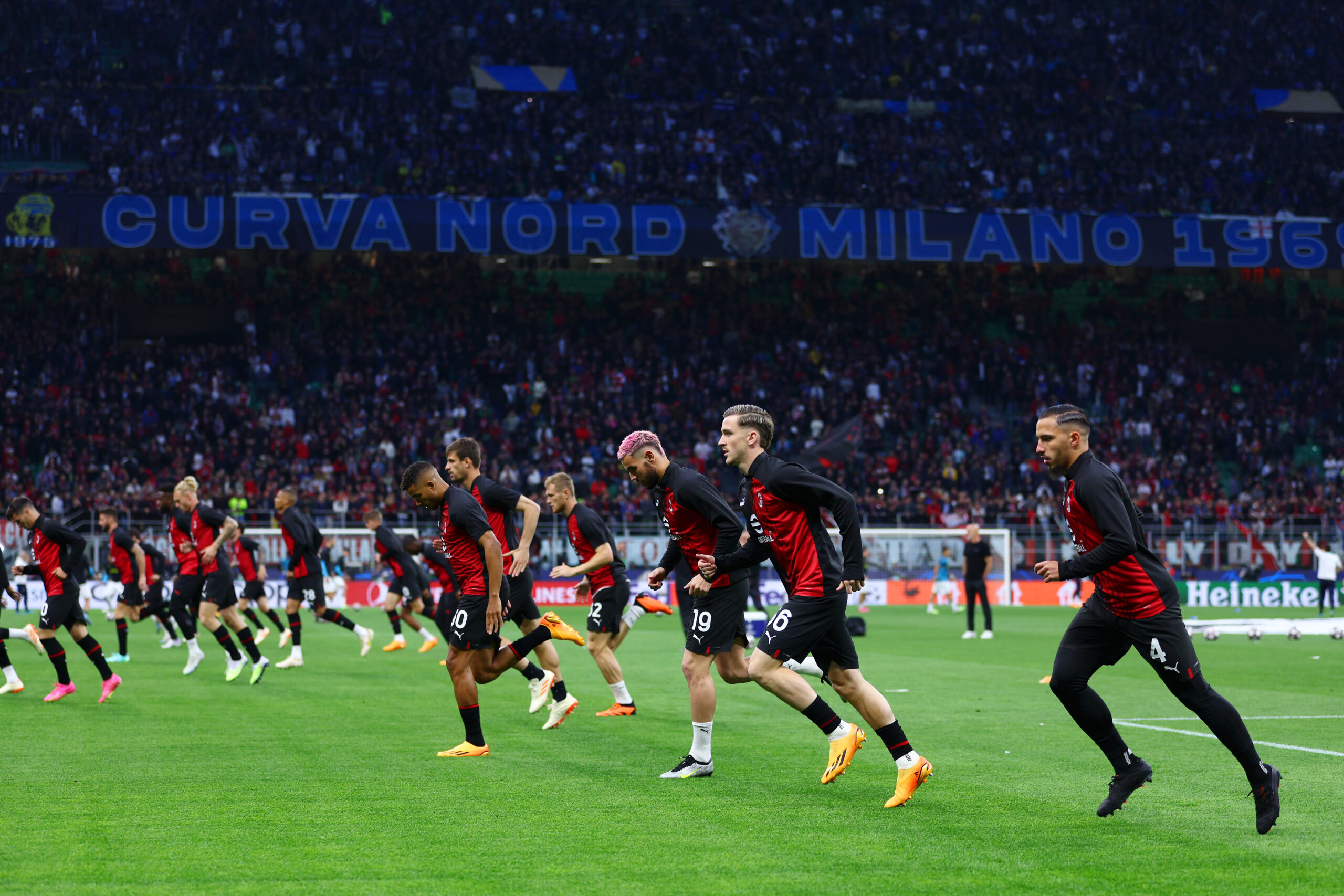 MILAN, ITALY - MAY 10: A general view as players of AC Milan warm up prior to the UEFA Champions League semi-final first leg match between AC Milan and FC Internazionale at San Siro on May 10, 2023 in Milan, Italy. (Photo by Clive Rose/Getty Images)