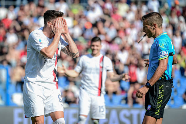 Italian referee Davide Massa (R) speaks with AC Milan's French forward #09 Olivier Giroud during the Italian Serie A football match between Unione Sportiva Sassuolo and AC Milan at the Mapei Stadium in Reggio Emilia, on April 14, 2024. (Photo by Piero CRUCIATTI / AFP) (Photo by PIERO CRUCIATTI/AFP via Getty Images)