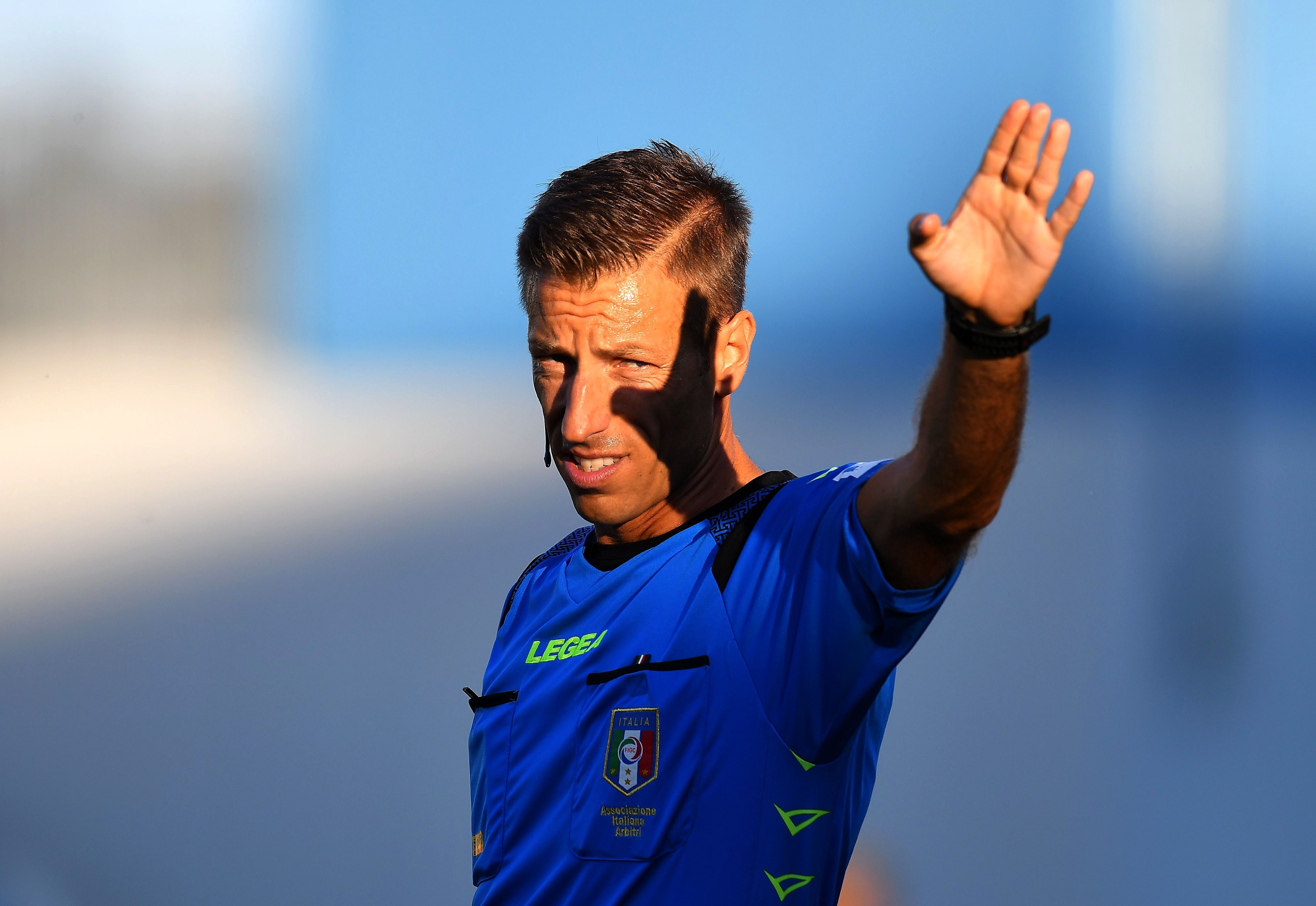 REGGIO NELL'EMILIA, ITALY - JULY 04: Referee Davide Massa gestures during the Serie A match between US Sassuolo and US Lecce at Mapei Stadium - Città del Tricolore on July 04, 2020 in Reggio nell'Emilia, Italy. (Photo by Alessandro Sabattini/Getty Images)