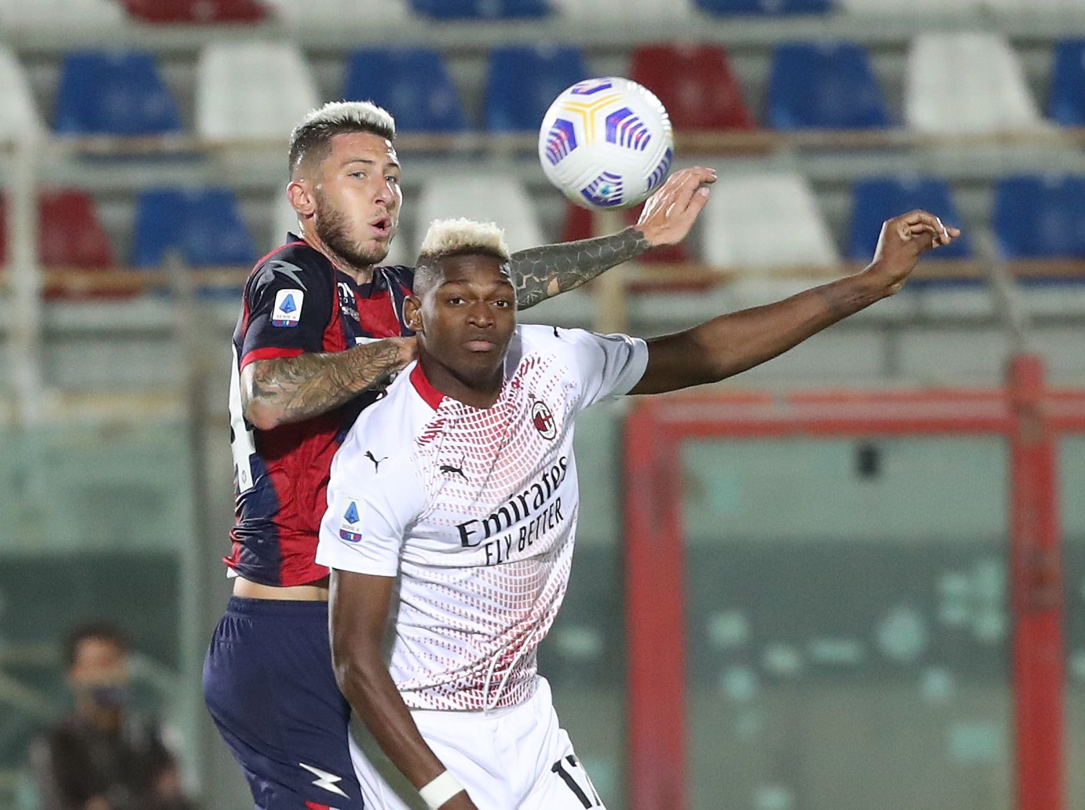 CROTONE, ITALY - SEPTEMBER 27: Luca Marrone of Crotone competes for the ball n air with Rafael Leao of Milan during the Serie A match between FC Crotone and AC Milan at Stadio Comunale Ezio Scida on September 27, 2020 in Crotone, Italy. (Photo by Maurizio Lagana/Getty Images)