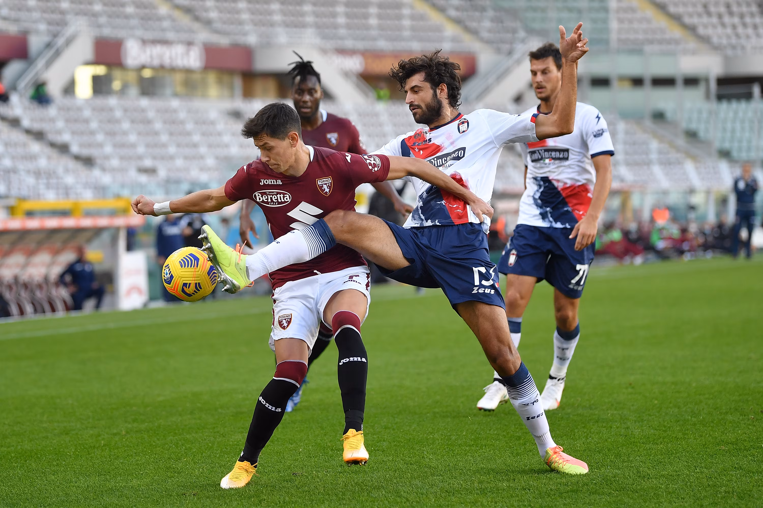 TURIN, ITALY - NOVEMBER 08: Sasa Lukic (L) of Torino FC is challenged by Sebastiano Luperto of FC Crotone during the Serie A match between Torino FC and FC Crotone at Stadio Olimpico di Torino on November 8, 2020 in Turin, Italy. (Photo by Valerio Pennicino/Getty Images)
