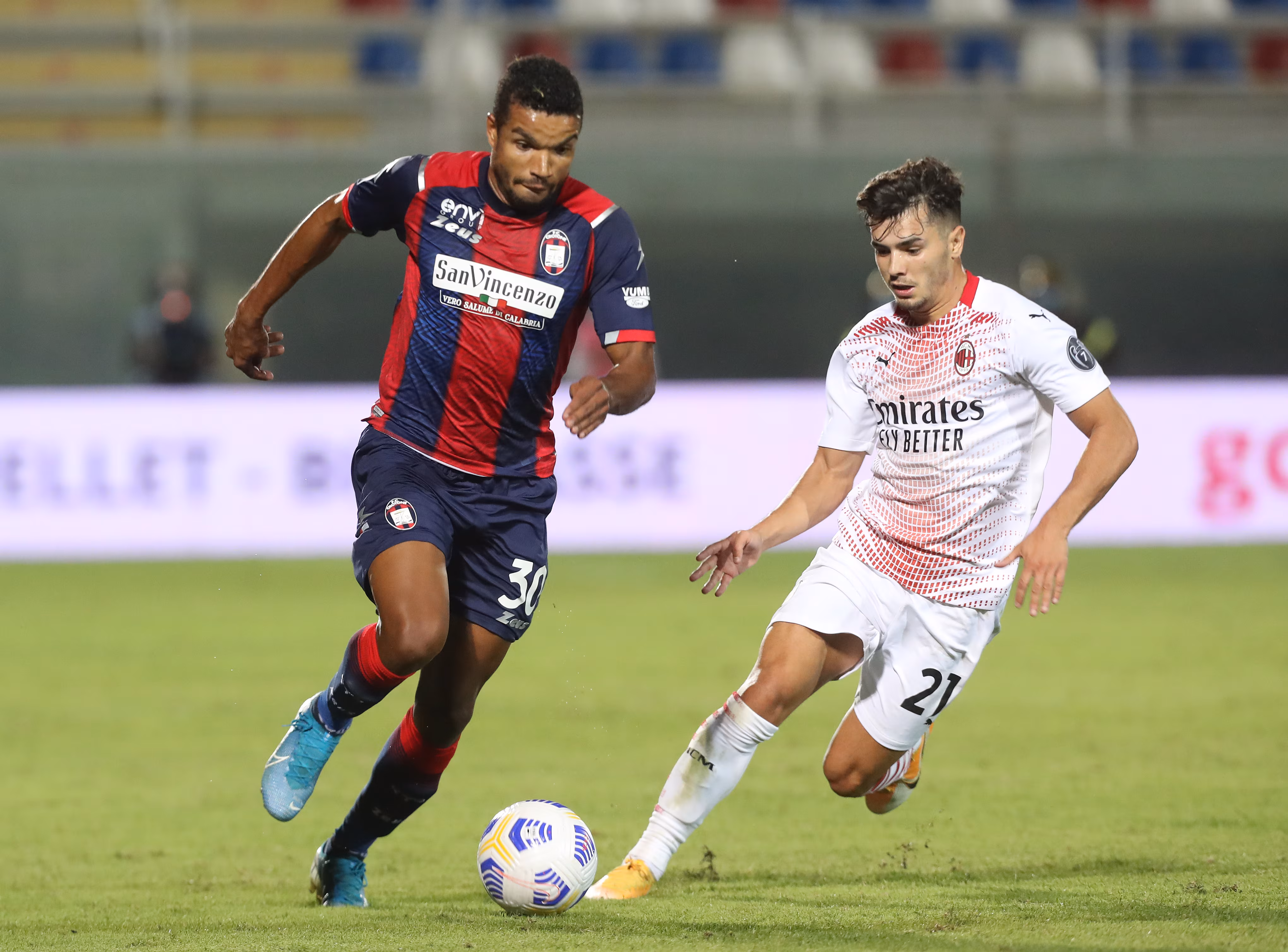 CROTONE, ITALY - SEPTEMBER 27: Junior Messias of Crotone competes for the ball with Ismael Bennacer of Milan during the Serie A match between FC Crotone and AC Milan at Stadio Comunale Ezio Scida on September 27, 2020 in Crotone, Italy. (Photo by Maurizio Lagana/Getty Images)