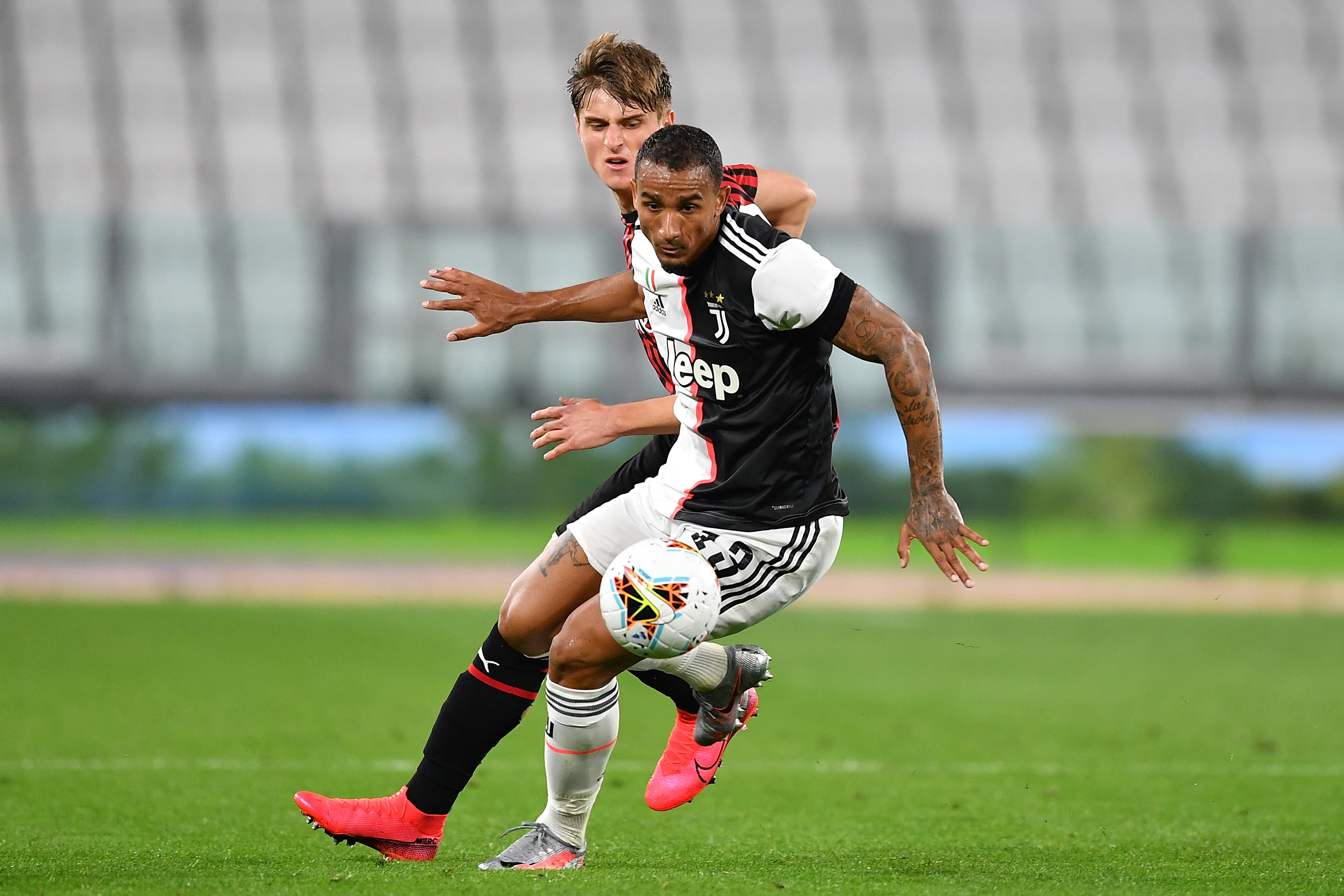 TURIN, ITALY - JUNE 12: Danilo (R) of Juventus is challenged by Lorenzo Colombo of AC Milan during the Coppa Italia Semi-Final Second Leg match between Juventus and AC Milan at Allianz Stadium on June 12, 2020 in Turin, Italy. (Photo by Valerio Pennicino/Getty Images)