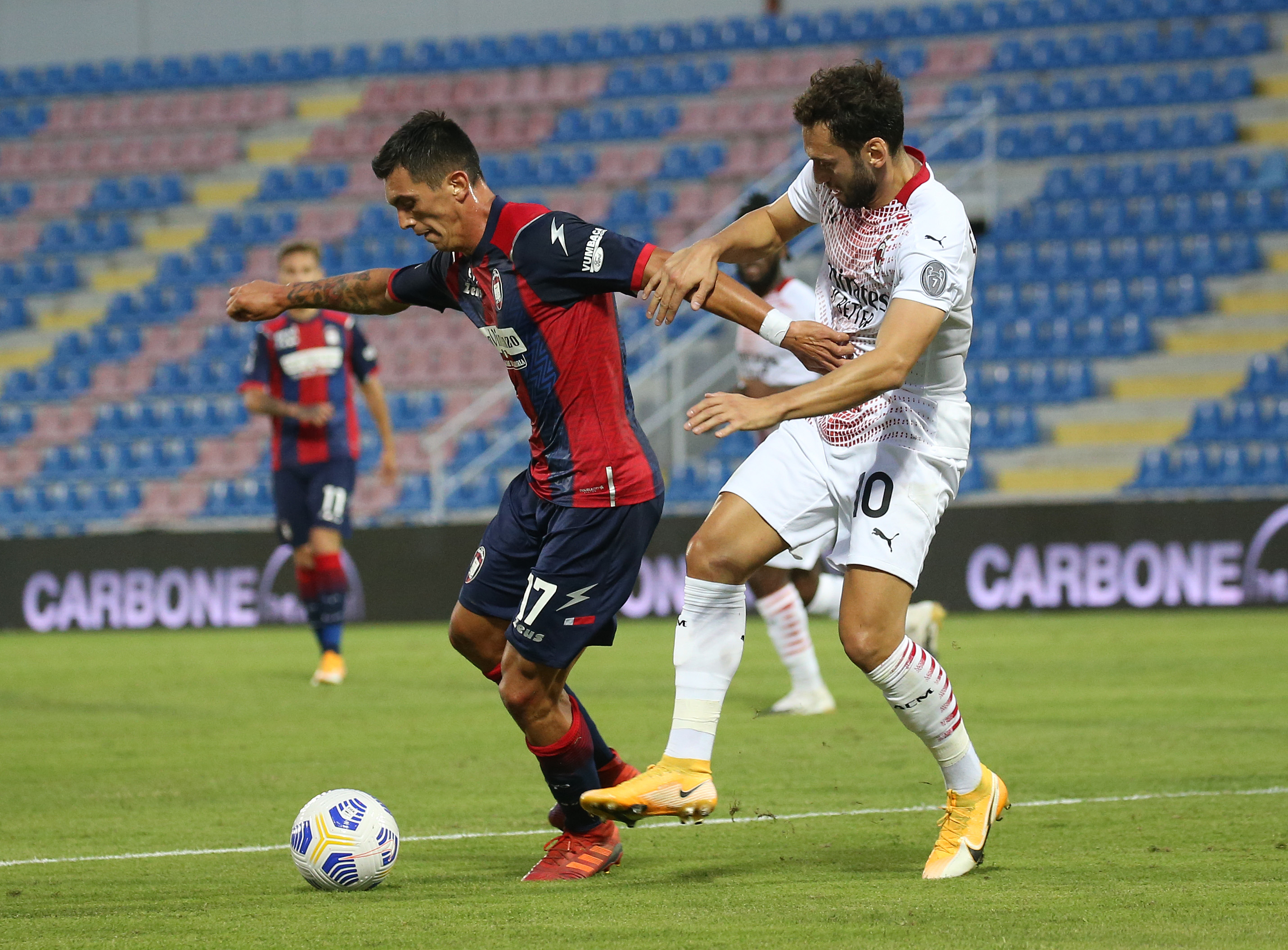 CROTONE, ITALY - SEPTEMBER 27: Salvatore Molina of Crotone competes for the ball with Akan Calhanoglu of Milan during the Serie A match between FC Crotone and AC Milan at Stadio Comunale Ezio Scida on September 27, 2020 in Crotone, Italy. (Photo by Maurizio Lagana/Getty Images)