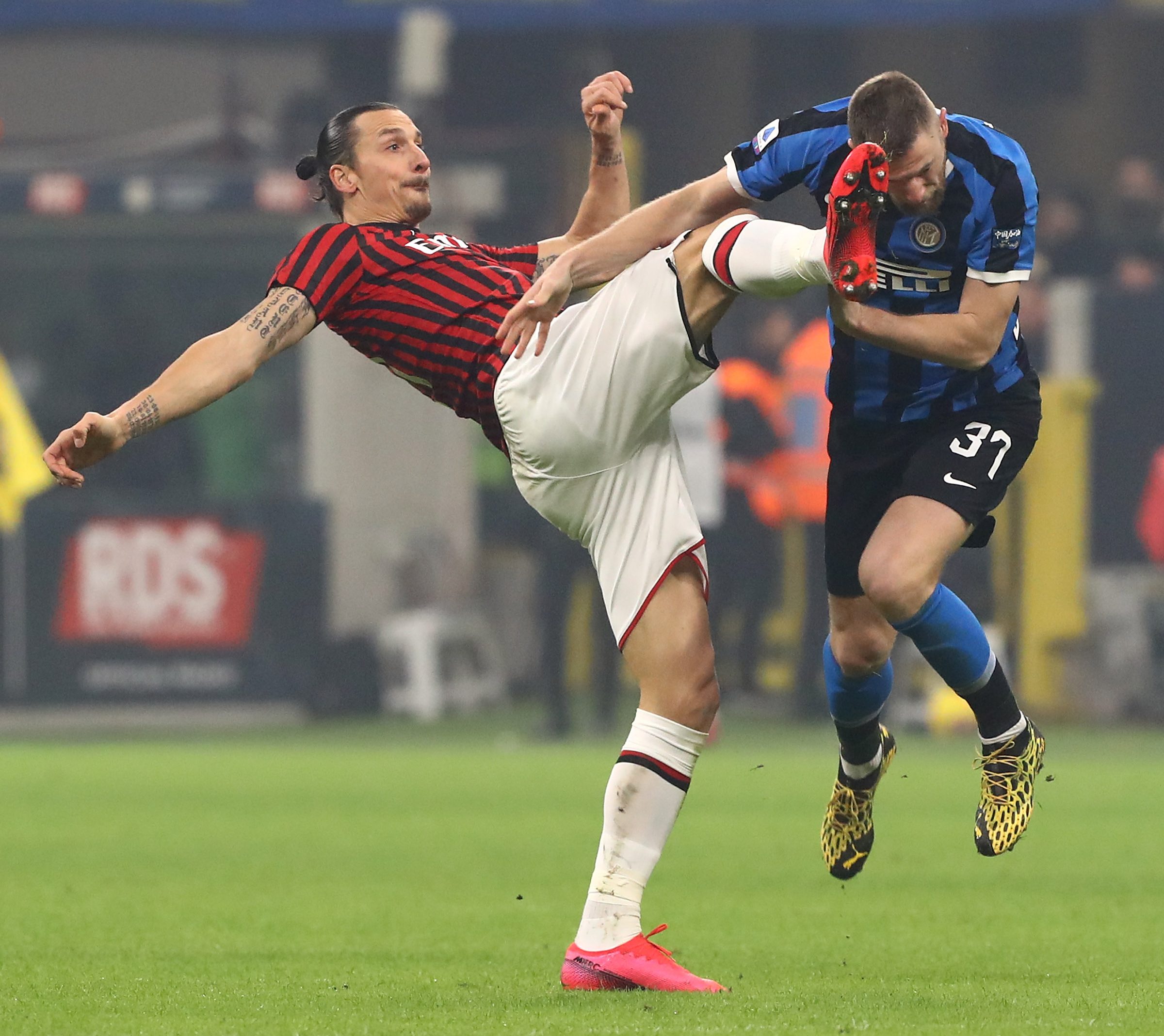 Zlatan Ibrahimovic contrasta Milan Skriniar durante lo scorso derby milanese.
