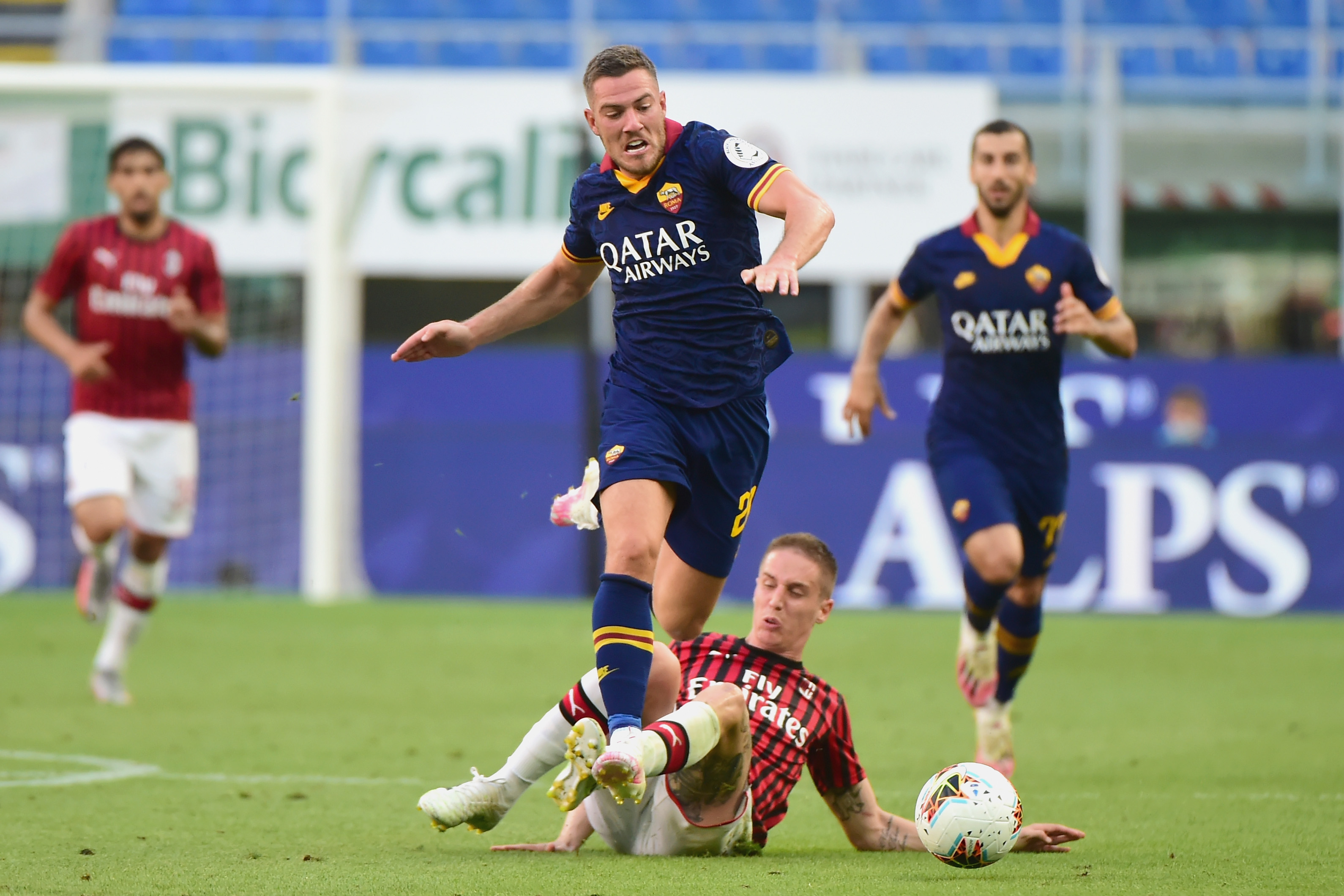 MILAN, ITALY - JUNE 28: Jordan Marcel Gilbert Veretout of AS Roma in action during the Serie A match between AC Milan and AS Roma at Stadio Giuseppe Meazza on June 28, 2020 in Milan, Italy. (Photo by Pier Marco Tacca/Getty Images)