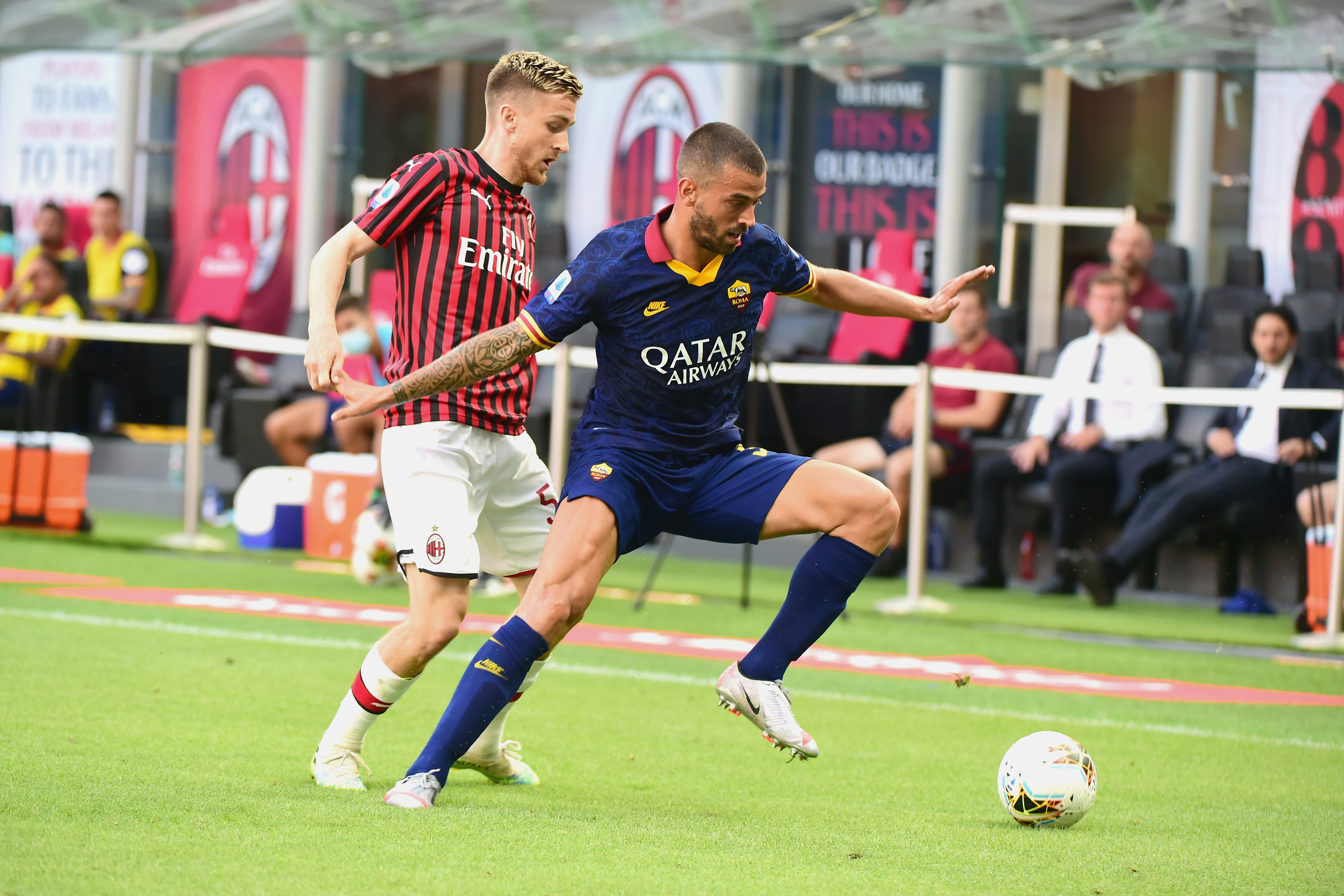 MILAN, ITALY - JUNE 28: (L - R) Alexis Saelemaekers of AC Milan competes for the ball with Leonardo Spinazzola of AS Roma during the Serie A match between AC Milan and AS Roma at Stadio Giuseppe Meazza on June 28, 2020 in Milan, Italy. (Photo by Pier Marco Tacca/Getty Images)