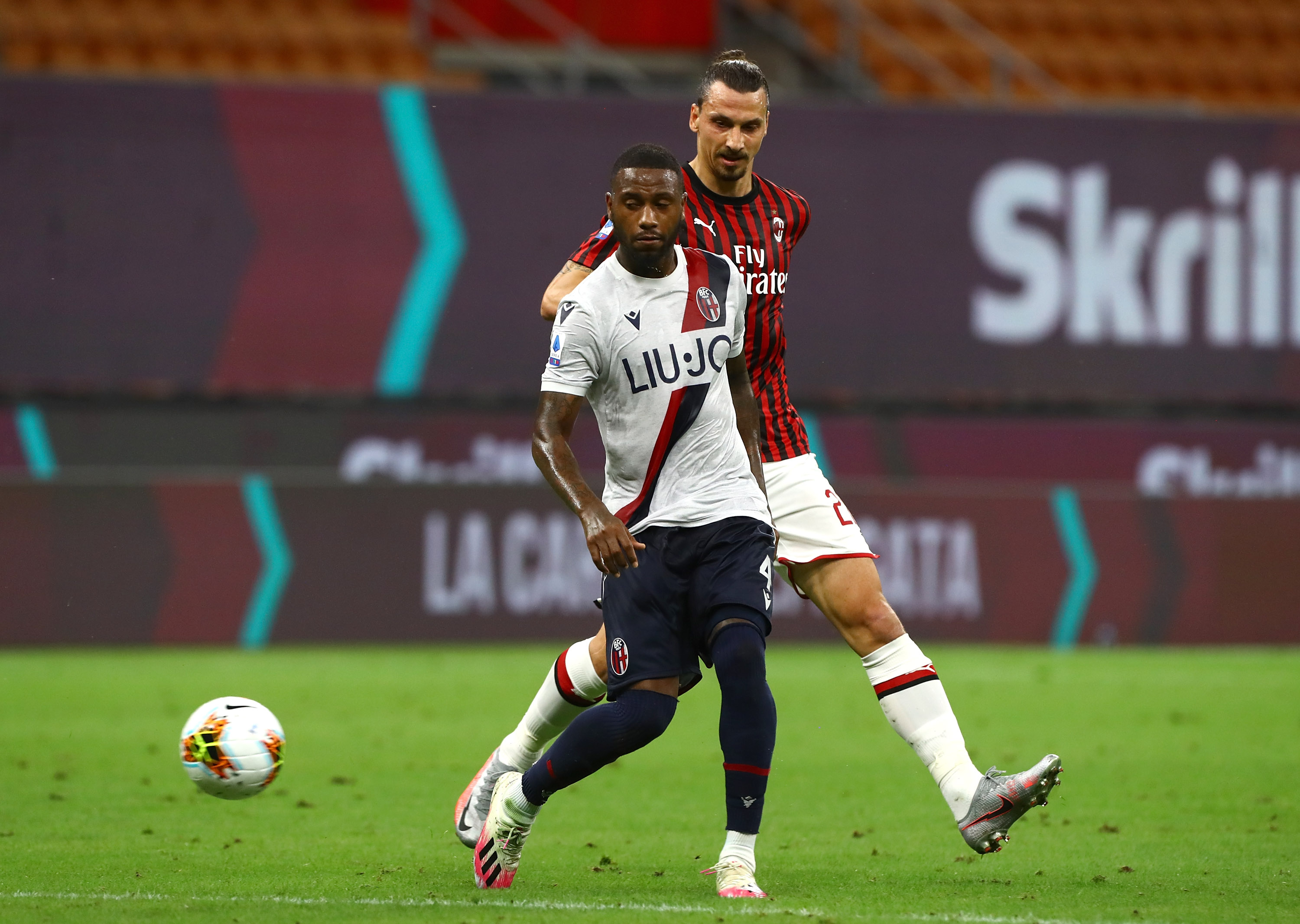 MILAN, ITALY - JULY 18: Stefano Denswil of Bologna FC is challenged by Zlatan Ibrahimovic (back) of AC Milan during the Serie A match between AC Milan and Bologna FC at Stadio Giuseppe Meazza on July 18, 2020 in Milan, Italy. (Photo by Marco Luzzani/Getty Images)