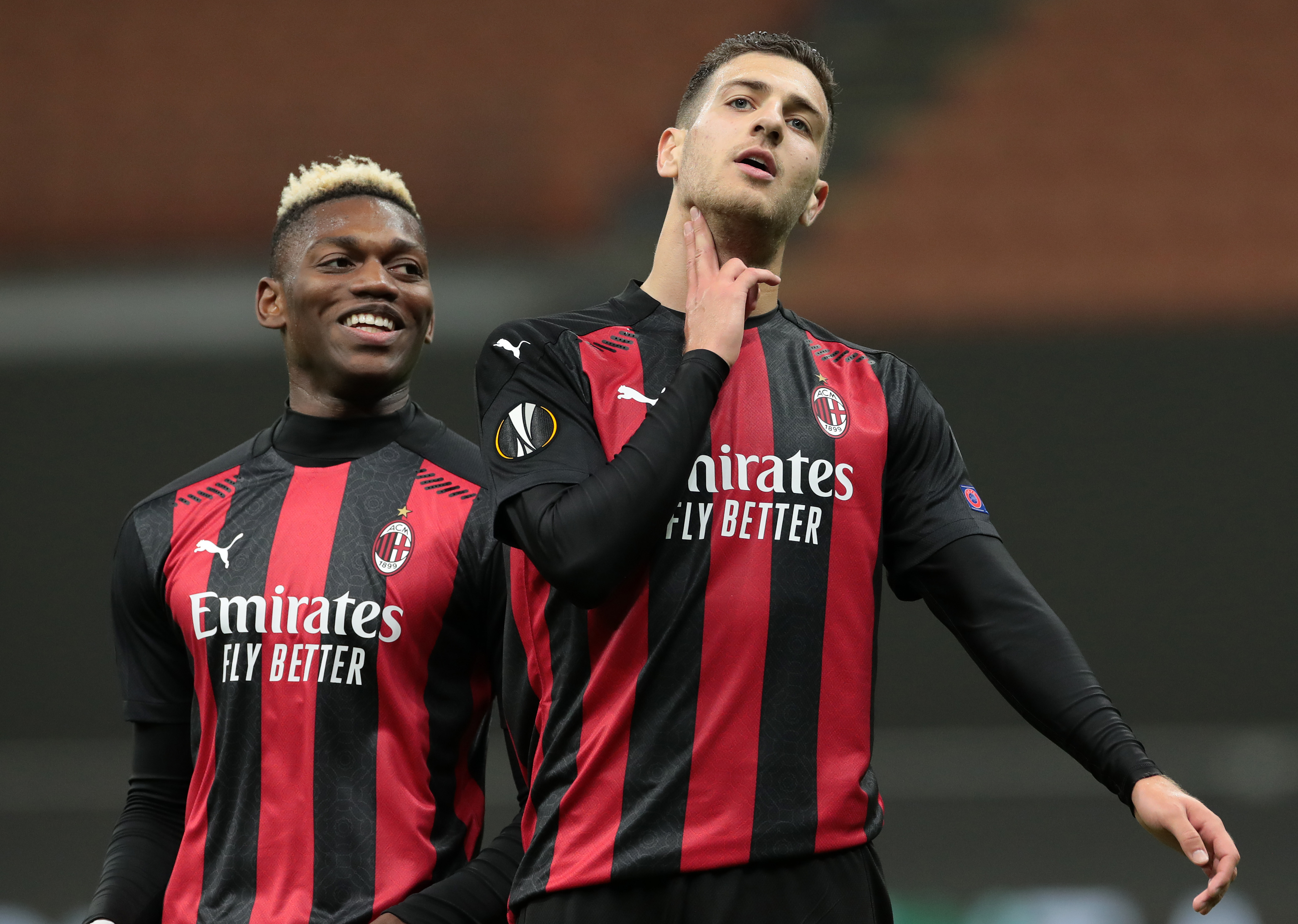 MILAN, ITALY - OCTOBER 29: Diogo Dalot (front) of AC Milan celebrates after scoring the second goal of his team with his team-mate Rafael Leao during the UEFA Europa League Group H stage match between AC Milan and AC Sparta Praha at San Siro Stadium on October 29, 2020 in Milan, Italy. (Photo by Emilio Andreoli/Getty Images)