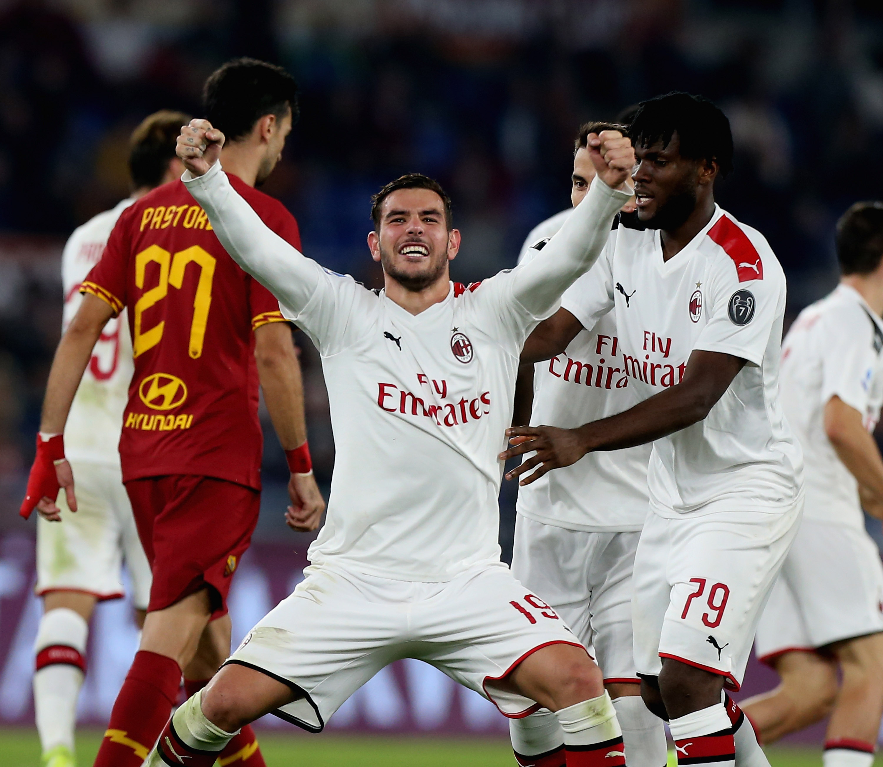 ROME, ITALY - OCTOBER 27: Theo Hernandez of AC Milan celebrates after scoring the team's first goal during the Serie A match between AS Roma and AC Milan at Stadio Olimpico on October 27, 2019 in Rome, Italy. (Photo by Paolo Bruno/Getty Images)
