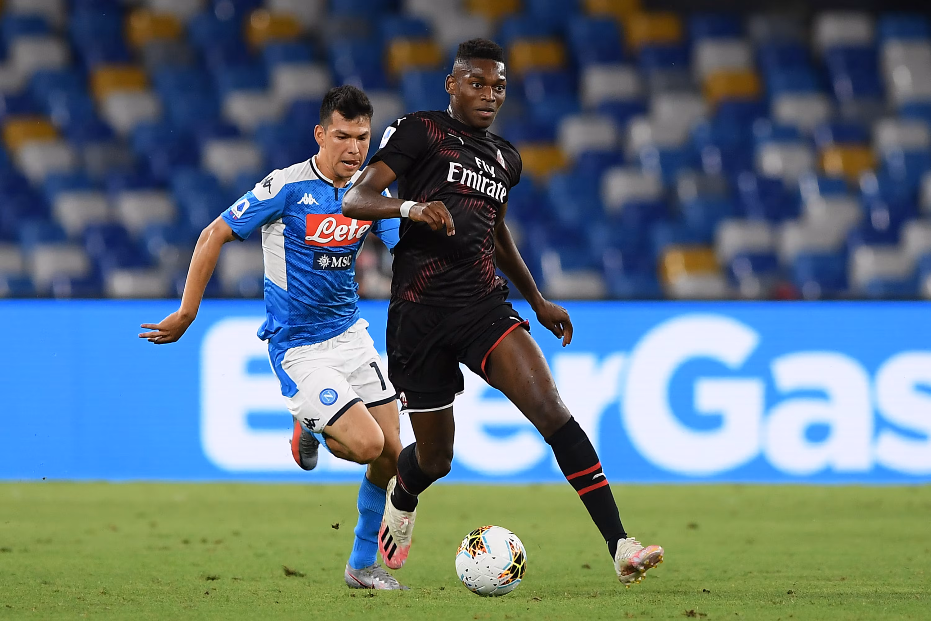 NAPLES, ITALY - JULY 12: Rafael Leao of AC Milan vies with Hirving Lozano of SSC Napoli during the Serie A match between SSC Napoli and AC Milan at Stadio San Paolo on July 12, 2020 in Naples, Italy. (Photo by Francesco Pecoraro/Getty Images)
