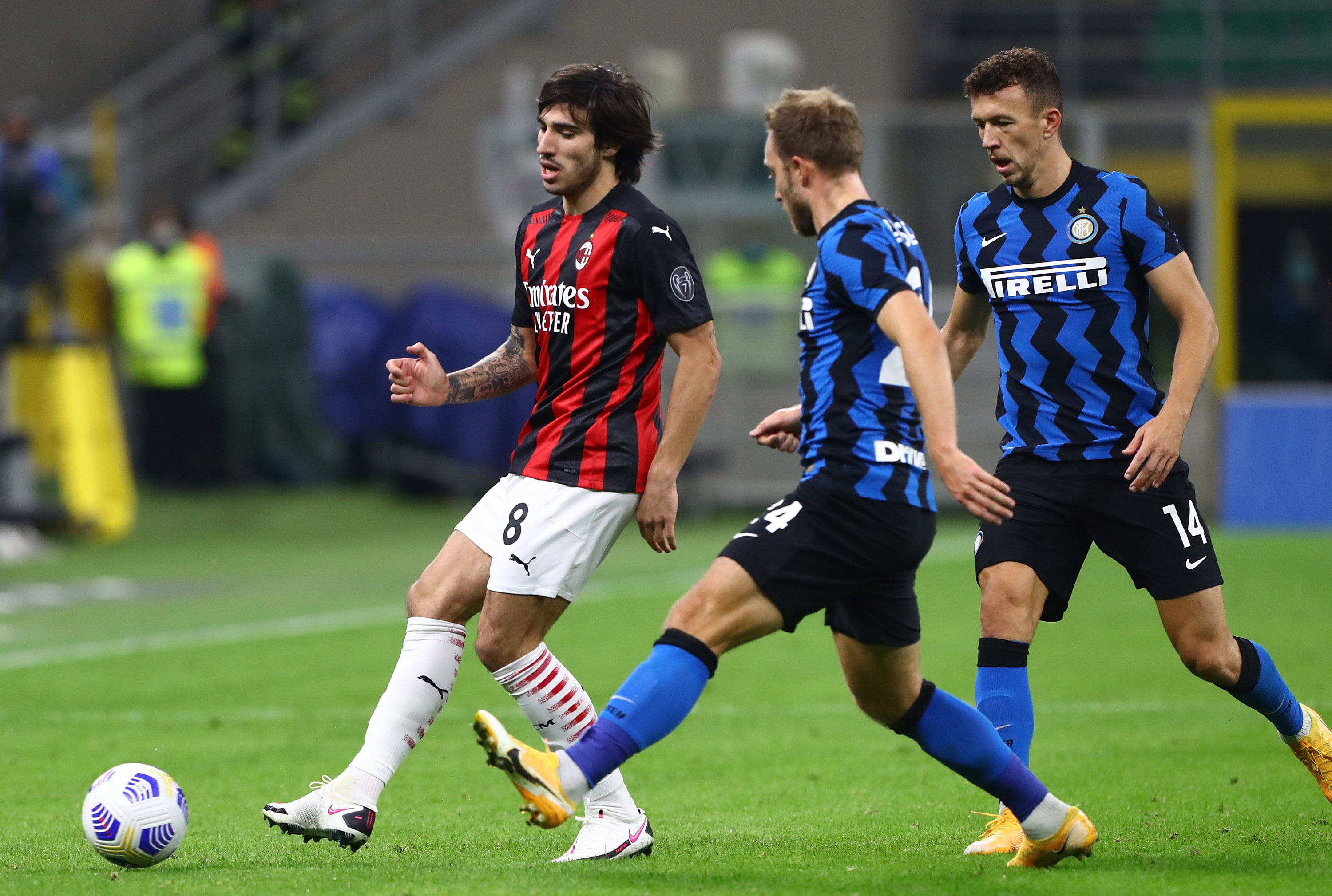 MILAN, ITALY - OCTOBER 17: Sandro Tonali of AC Milan is challenged by Christian Eriksen of FC Internazionale during the Serie A match between FC Internazionale and AC Milan at Stadio Giuseppe Meazza on October 17, 2020 in Milan, Italy. (Photo by Marco Luzzani/Getty Images)