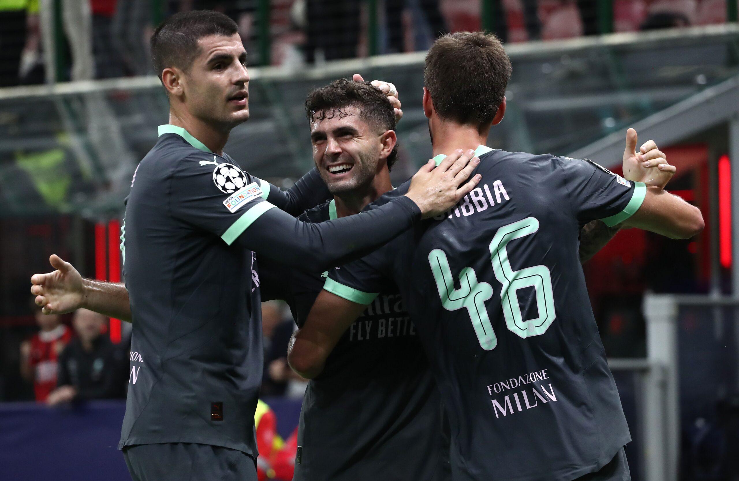 MILAN, ITALY - OCTOBER 22: Christian Pulisic of AC Milan celebrates after scoring the opening goal with his team-mates Alvaro Morata and Matteo Gabbia during the UEFA Champions League 2024/25 League Phase MD3 match between AC Milan and Club Brugge KV at Stadio San Siro on October 22, 2024 in Milan, Italy. (Photo by Marco Luzzani/Getty Images)