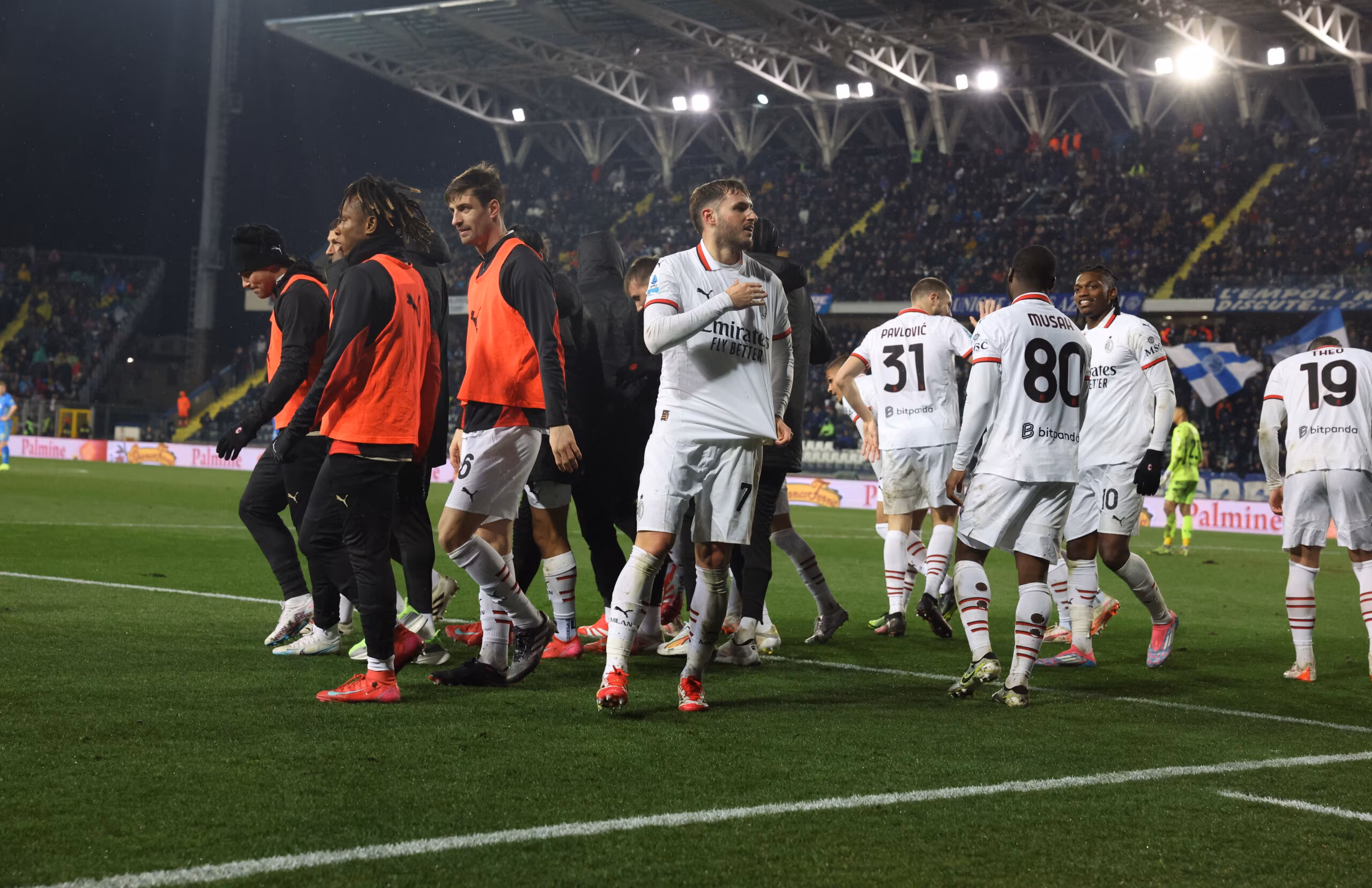 EMPOLI, ITALY - FEBRUARY 08: Santiago Gimenez of AC Milan celebrates with team-mates after scoring the goal during the Serie A match between Empoli and AC Milan at Stadio Carlo Castellani on February 08, 2025 in Empoli, Italy. (Photo by Claudio Villa/AC Milan via Getty Images)