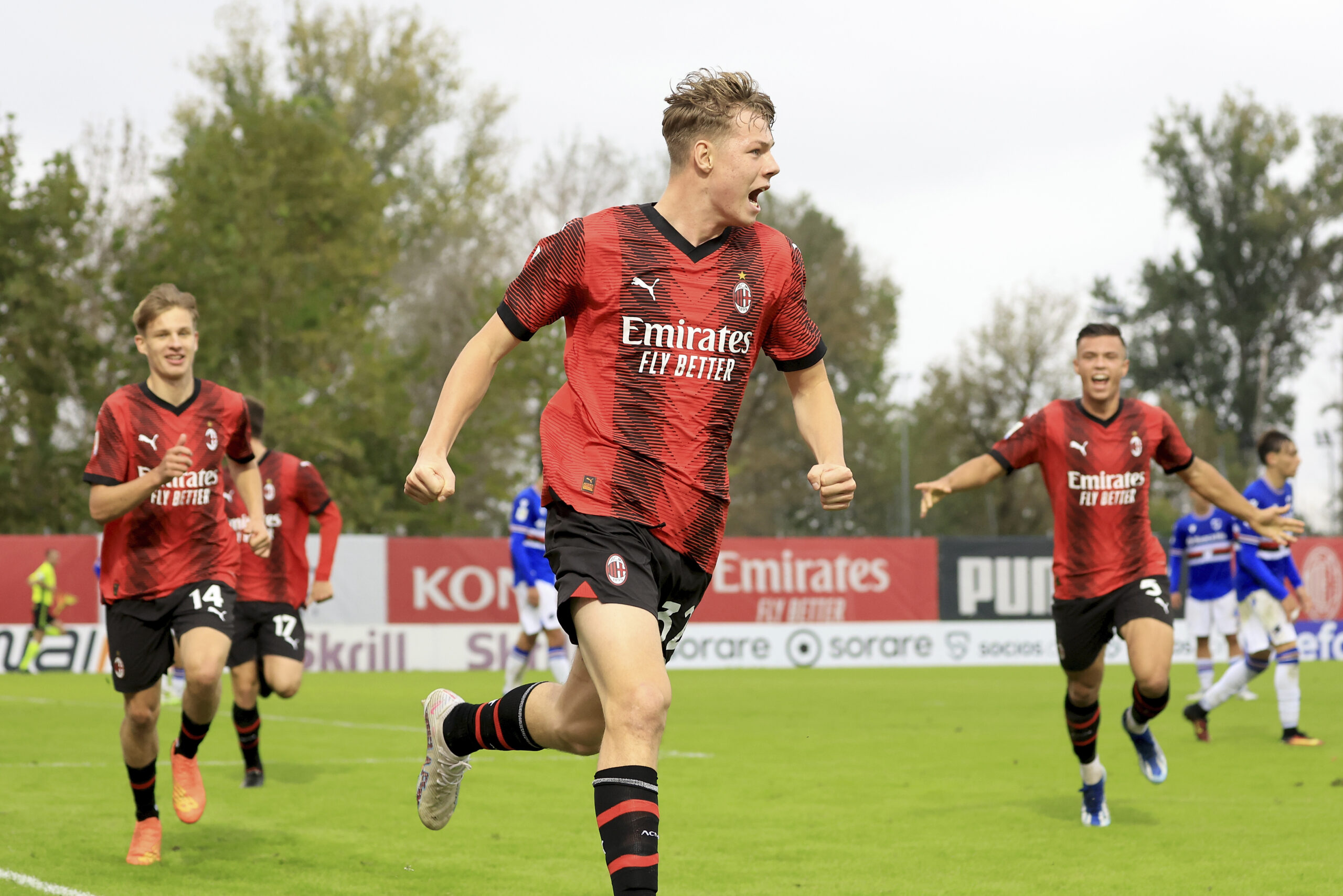 MILAN, ITALY - OCTOBER 29: Alexander Simmelhack of AC Milan celebrates after scoring the his team's second goal during the Primavera 1 match between AC Milan U19 and Sampdoria U19 at Vismara PUMA House of Football on October 29, 2023 in Milan, Italy. (Photo by Giuseppe Cottini/AC Milan via Getty Images)