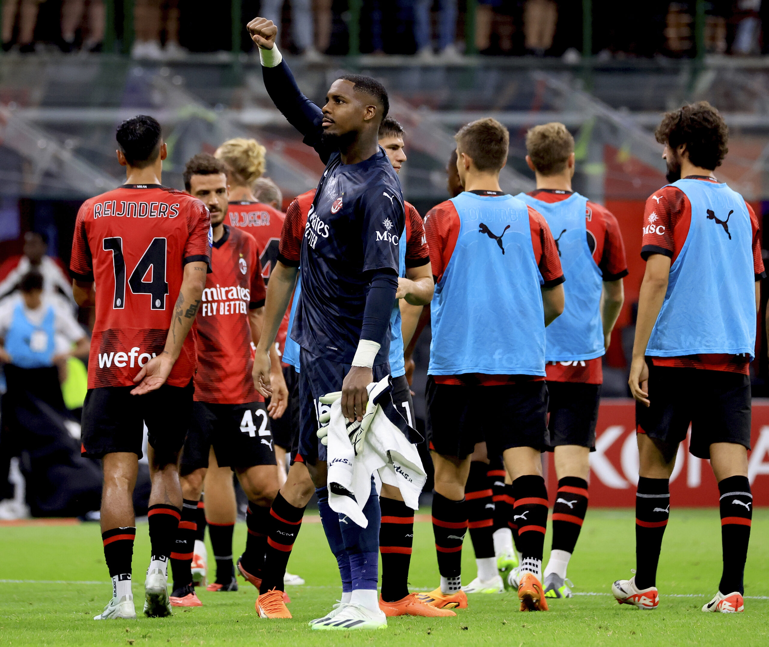 MILAN, ITALY - AUGUST 26: Mike Maignan of AC Milan celebrates winning at end of the Serie A TIM match between AC Milan and Torino FC at Stadio Giuseppe Meazza on August 26, 2023 in Milan, Italy. (Photo by Giuseppe Cottini/AC Milan via Getty Images )