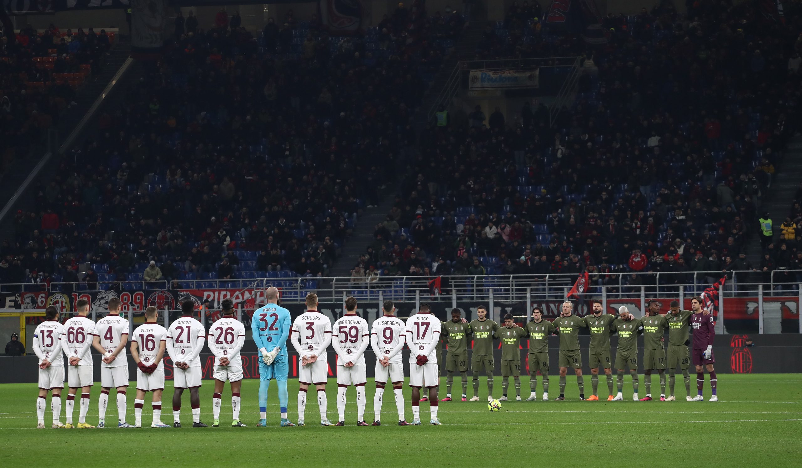 MILAN, ITALY - FEBRUARY 10: The players of both teams observe a minutes silence in respect of the victims of the earthquake in Turke during the Serie A match between AC MIlan and Torino FC at Stadio Giuseppe Meazza on February 10, 2023 in Milan, . (Photo by Marco Luzzani/Getty Images)