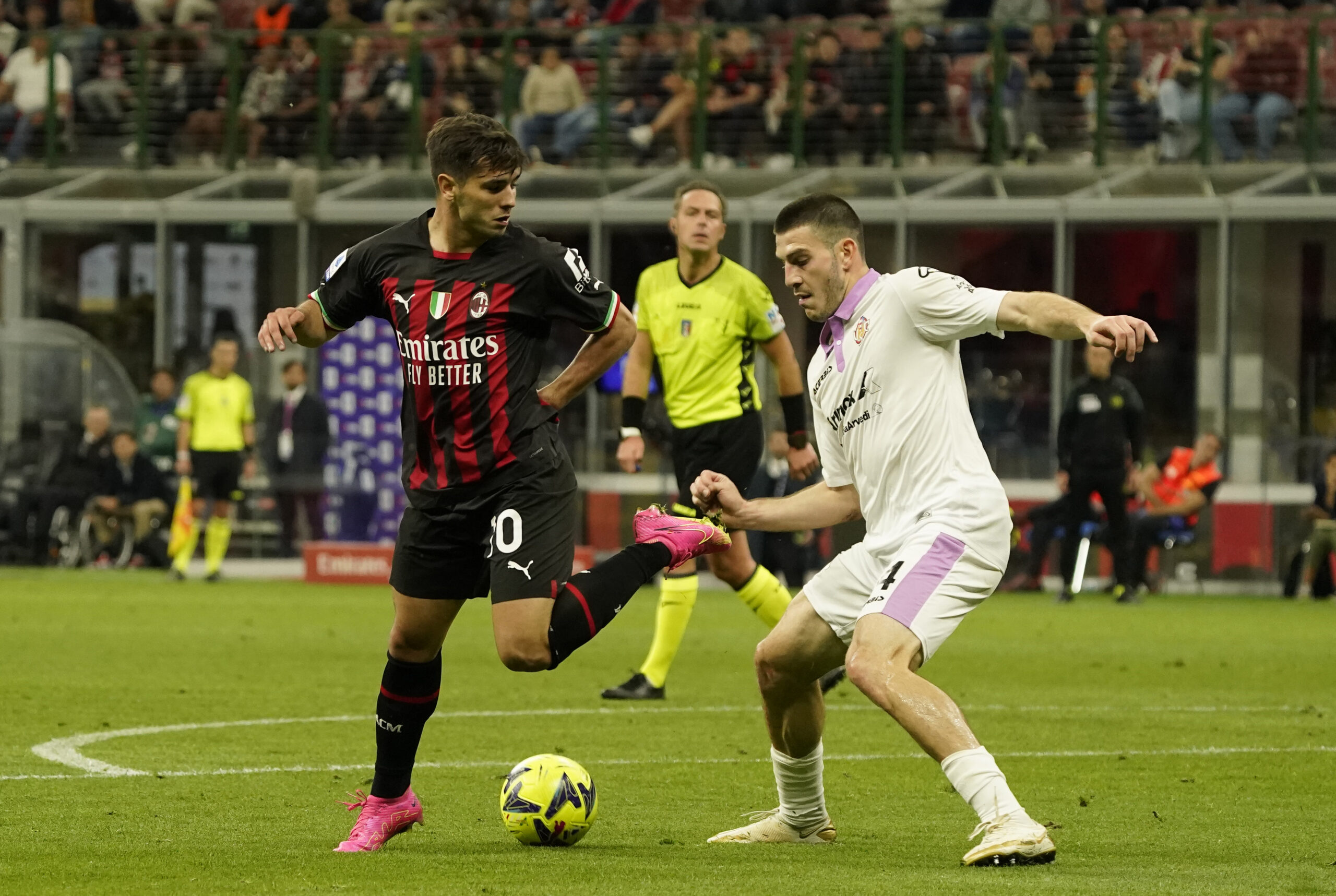 MILAN, ITALY - MAY 03: Brahim Díaz of AC Milan is tackled during the Serie A match between AC Milan and US Cremonese at Stadio Giuseppe Meazza on May 03, 2023 in Milan, Italy. (Photo by Pier Marco Tacca/AC Milan via Getty Images)
