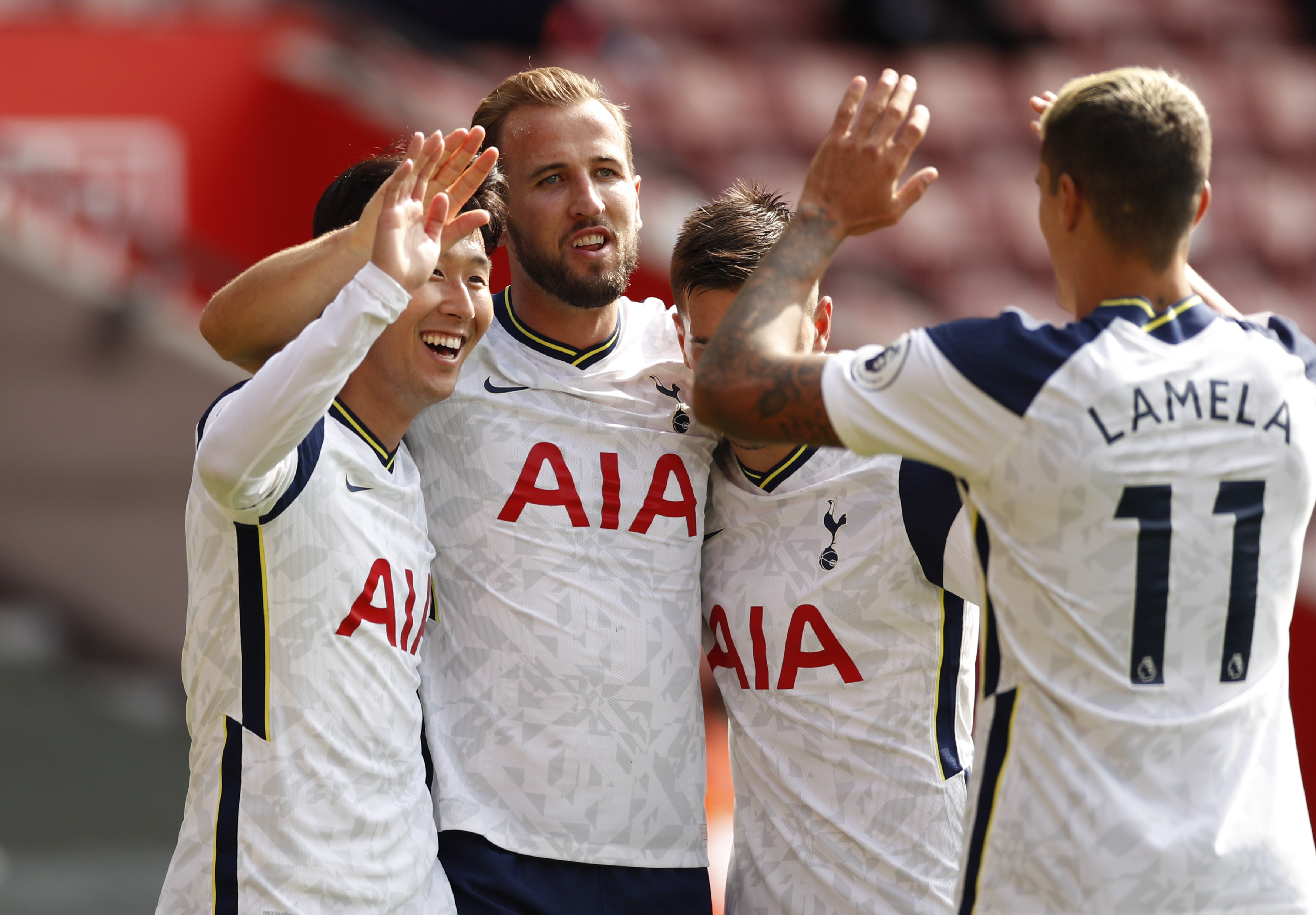 SOUTHAMPTON, ENGLAND - SEPTEMBER 20: Heung-Min Son of Tottenham Hotspur celebrates with teammates after scoring his team's third goal during the Premier League match between Southampton and Tottenham Hotspur at St Mary's Stadium on September 20, 2020 in Southampton, England. (Photo by Andrew Boyers - Pool/Getty Images)