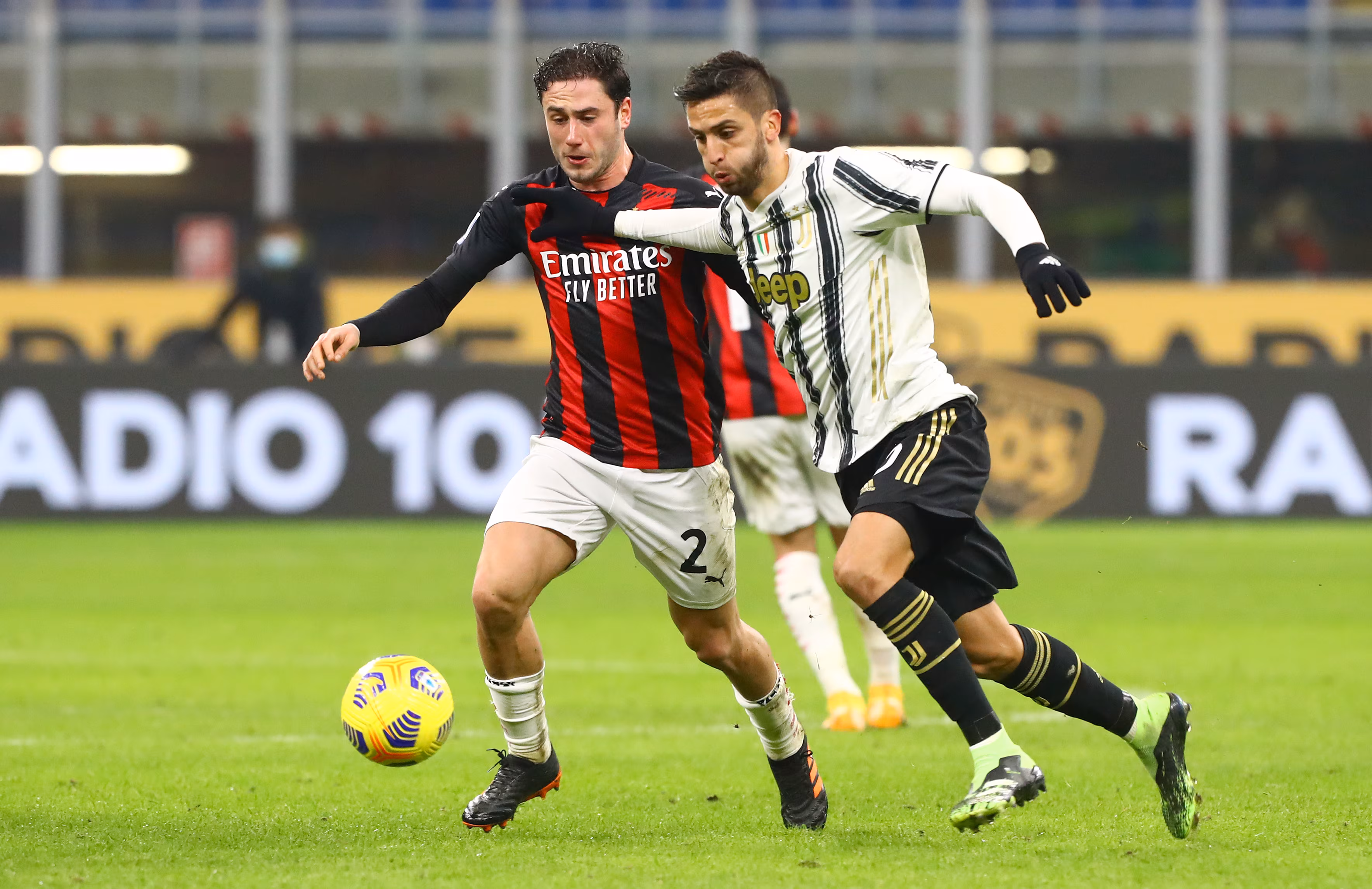 Contrasto fra Rodrigo Bentancur della Juventus e Davide Calabria del Milan