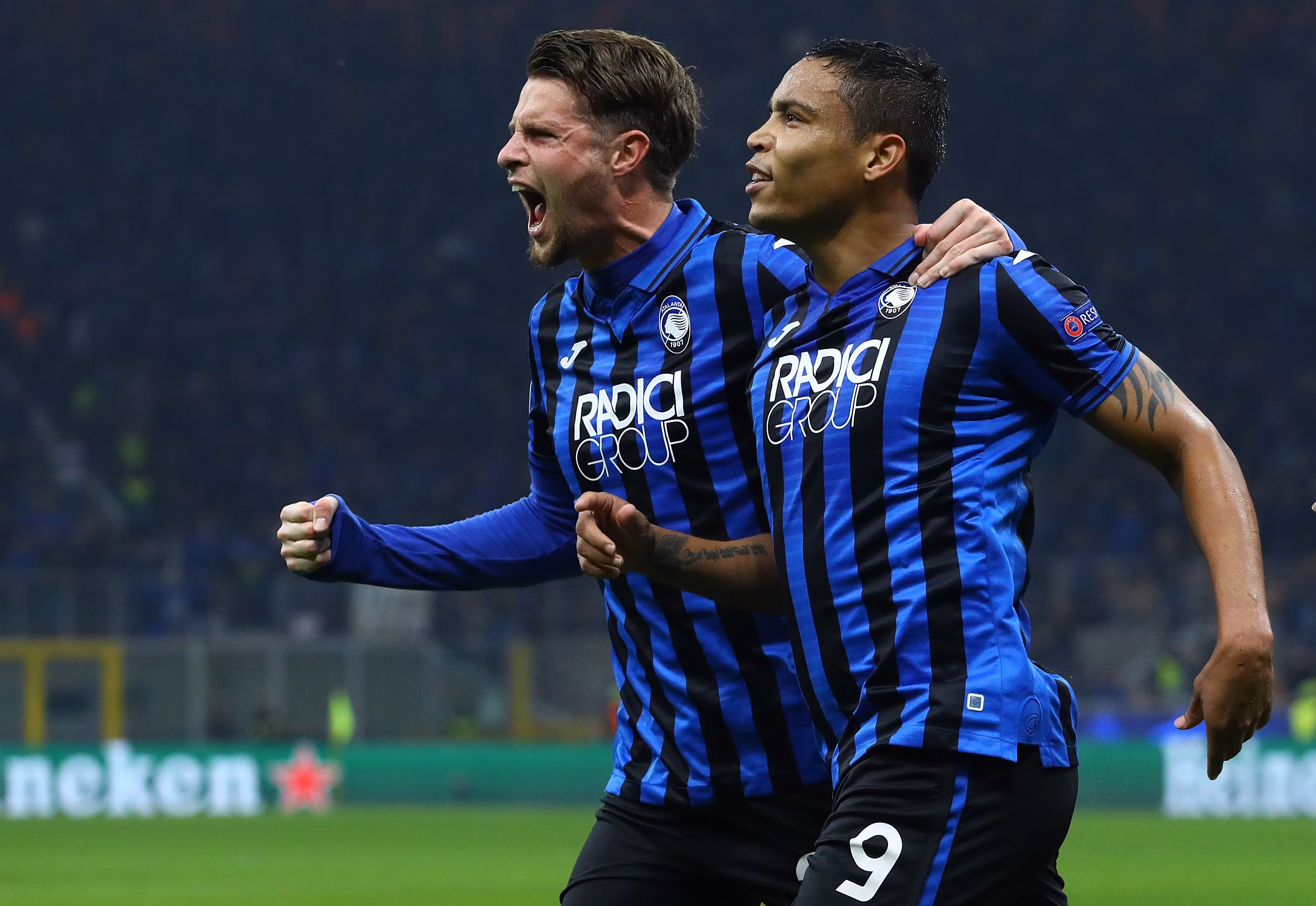 Muriel, punta dell'Atalanta, festeggia con il compagno Hateboer.
