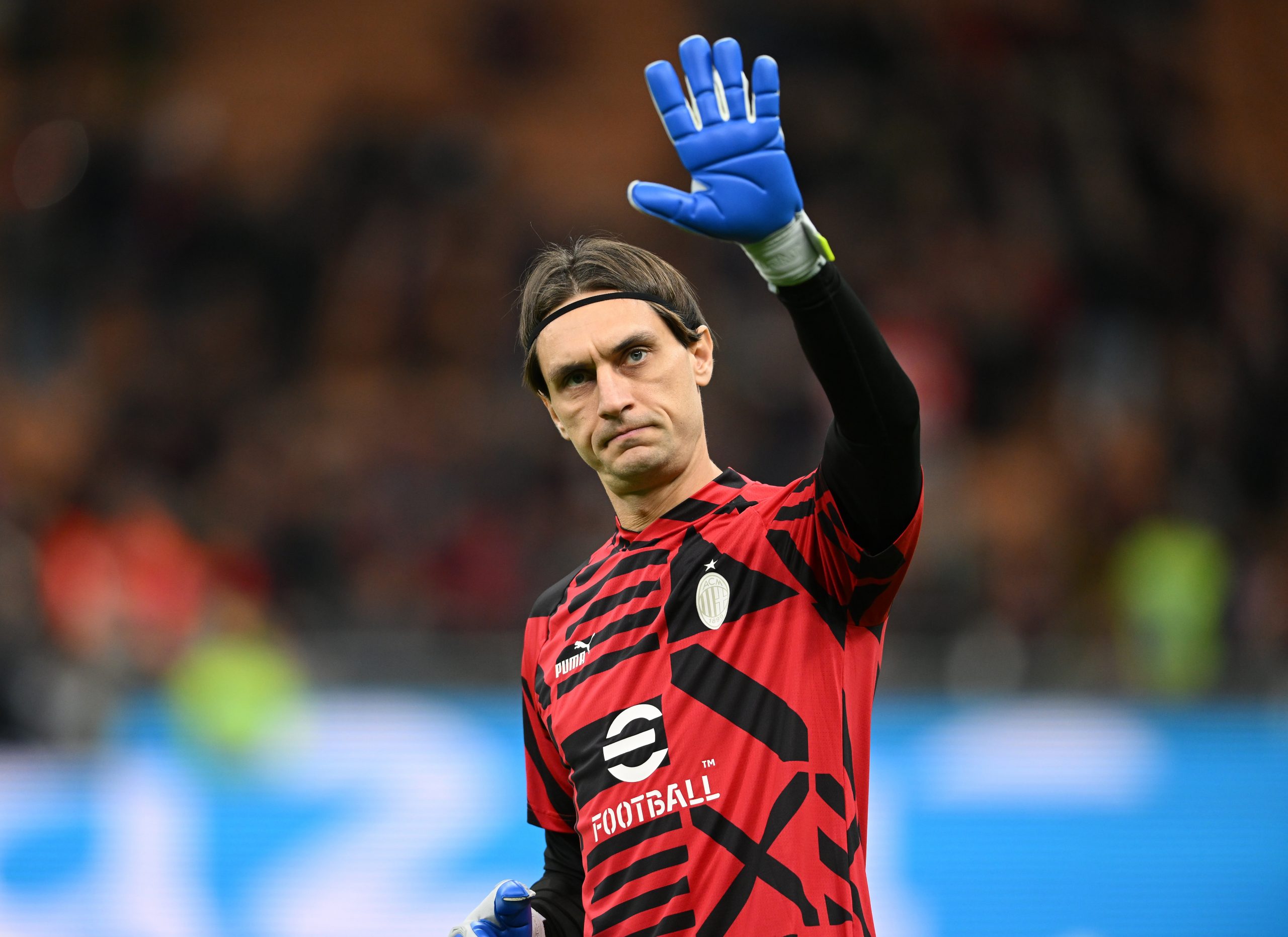 MILAN, ITALY - NOVEMBER 05: Ciprian Tatarusanu of AC Milan warms up ahead before the Serie A match between AC MIlan and Spezia Calcio at Stadio Giuseppe Meazza on November 05, 2022 in Milan, Italy. (Photo by Claudio Villa/AC Milan via Getty Images)