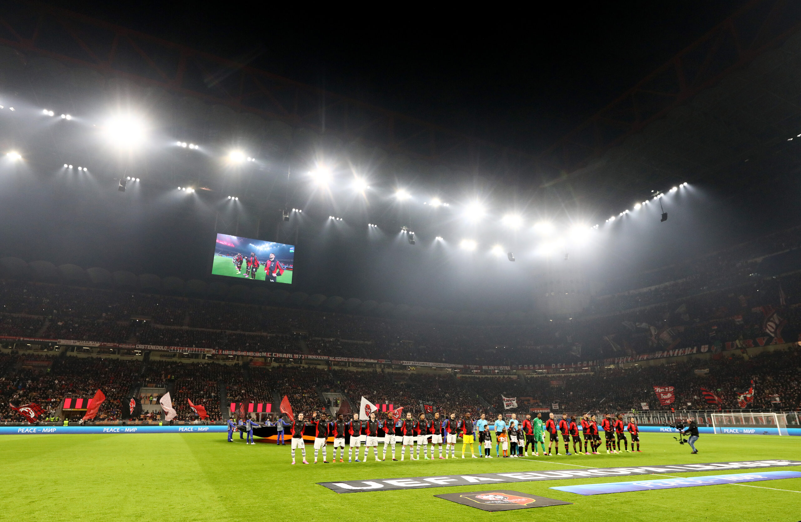 MILAN, ITALY - FEBRUARY 15: A general view of the inside of the stadium as players of AC Milan and Stade Rennais line up prior to the UEFA Europa League 2023/24 Playoff First Leg match between AC Milan and Stade Rennais FC at Stadio Giuseppe Meazza on February 15, 2024 in Milan, Italy. (Photo by Marco Luzzani/Getty Images)