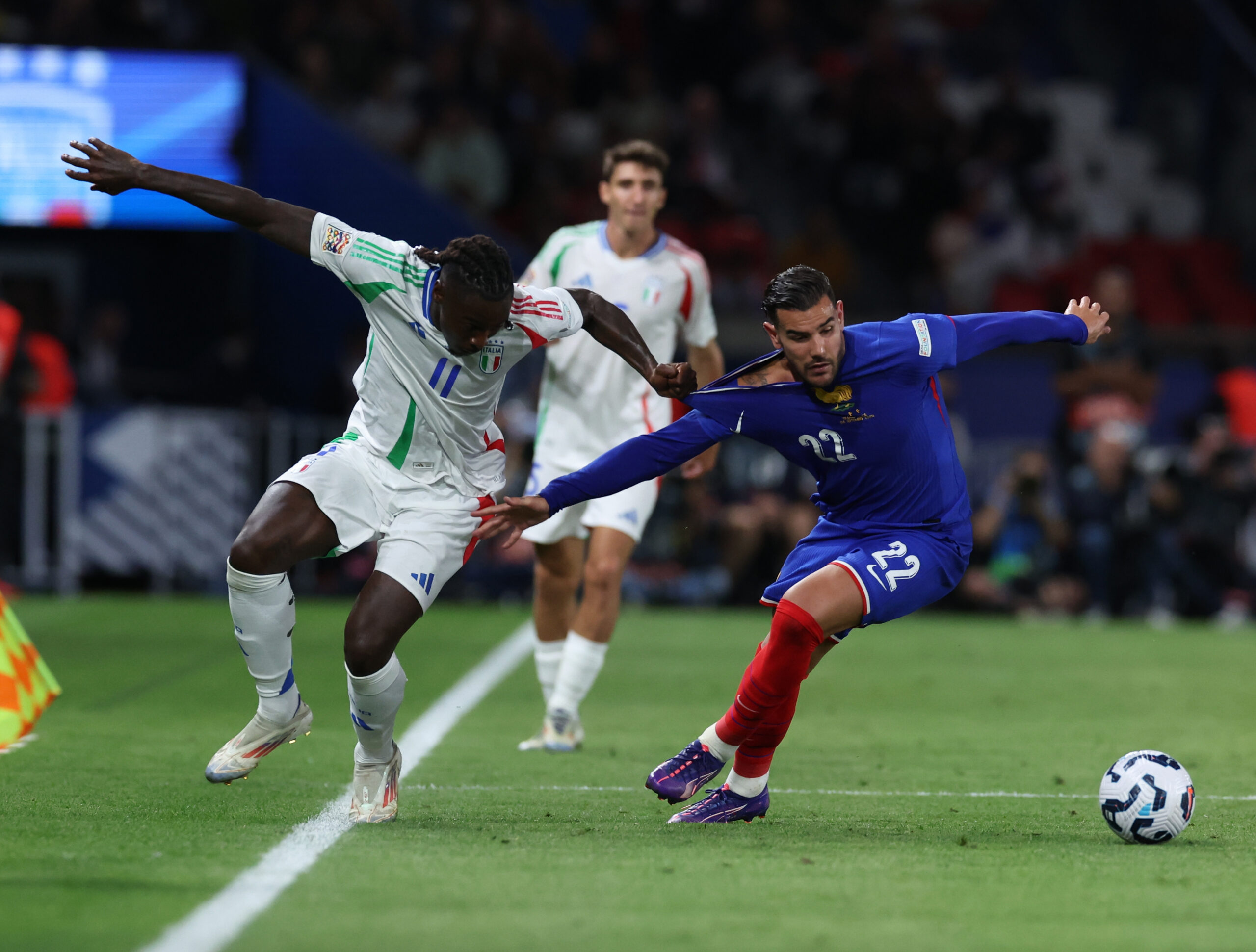PARIS, FRANCE - SEPTEMBER 06: Moise Kean of Italy competes for the ball with Theo Hernandez of France during the UEFA Nations League 2024/25 League A Group A2 match between France and Italy at Parc des Princes stadium on September 06, 2024 in Paris, France. (Photo by Claudio Villa/Getty Images)