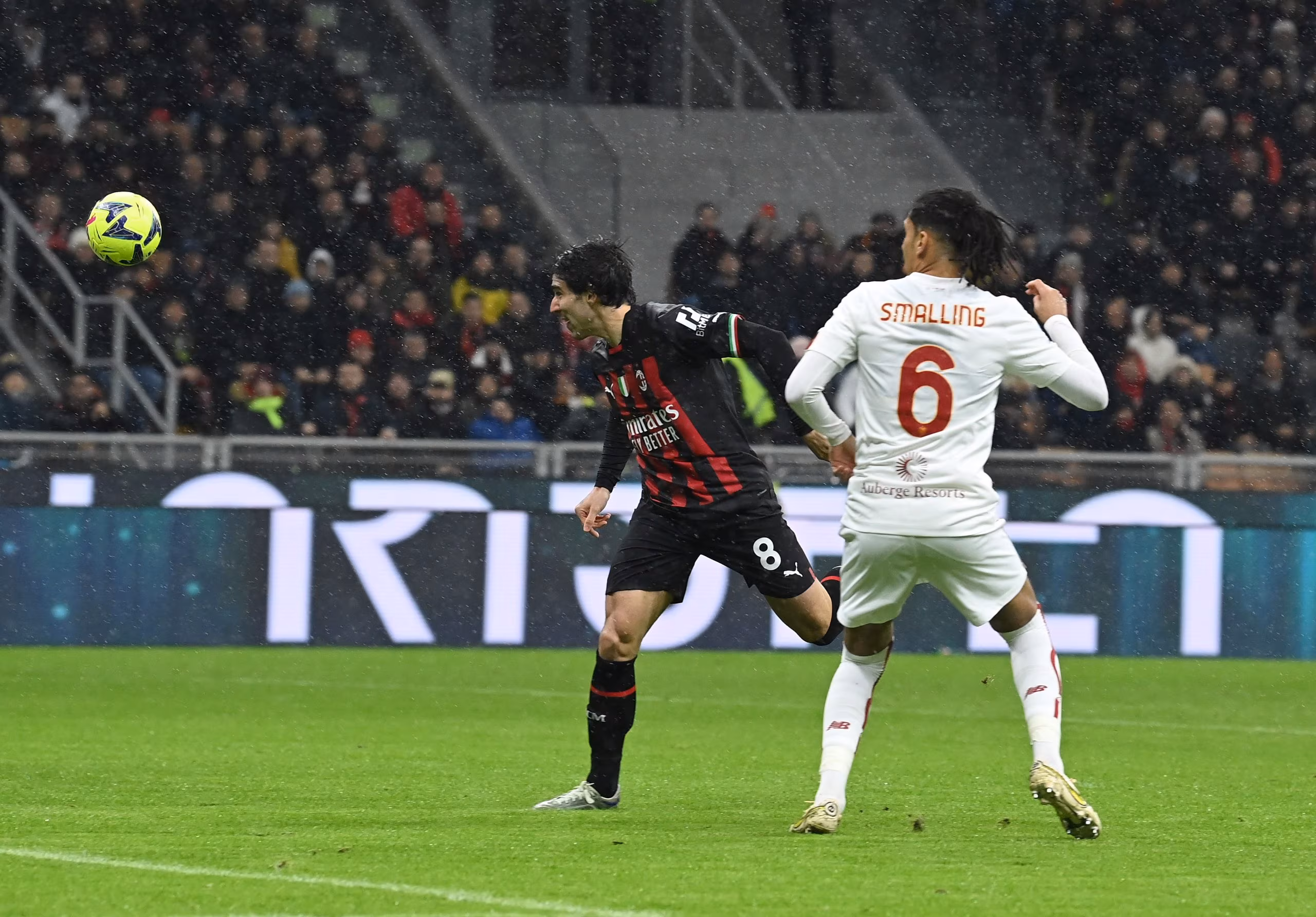 MILAN, ITALY - JANUARY 08: Sandro Tonali of AC Milan competes for the ball with Christopher Smalling of AS Roma during the Serie A match between AC MIlan and AS Roma at Stadio Giuseppe Meazza on January 08, 2023 in Milan, Italy. (Photo by Claudio Villa/AC Milan via Getty Images)