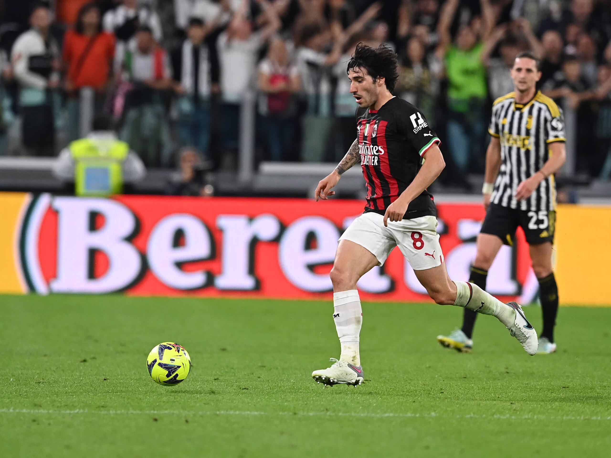 TURIN, ITALY - MAY 28: Sandro Tonali of AC Milan in action during the Serie A match between Juventus and AC Milan at Allianz Stadium on May 28, 2023 in Turin, Italy. (Photo by Claudio Villa/AC Milan via Getty Images)