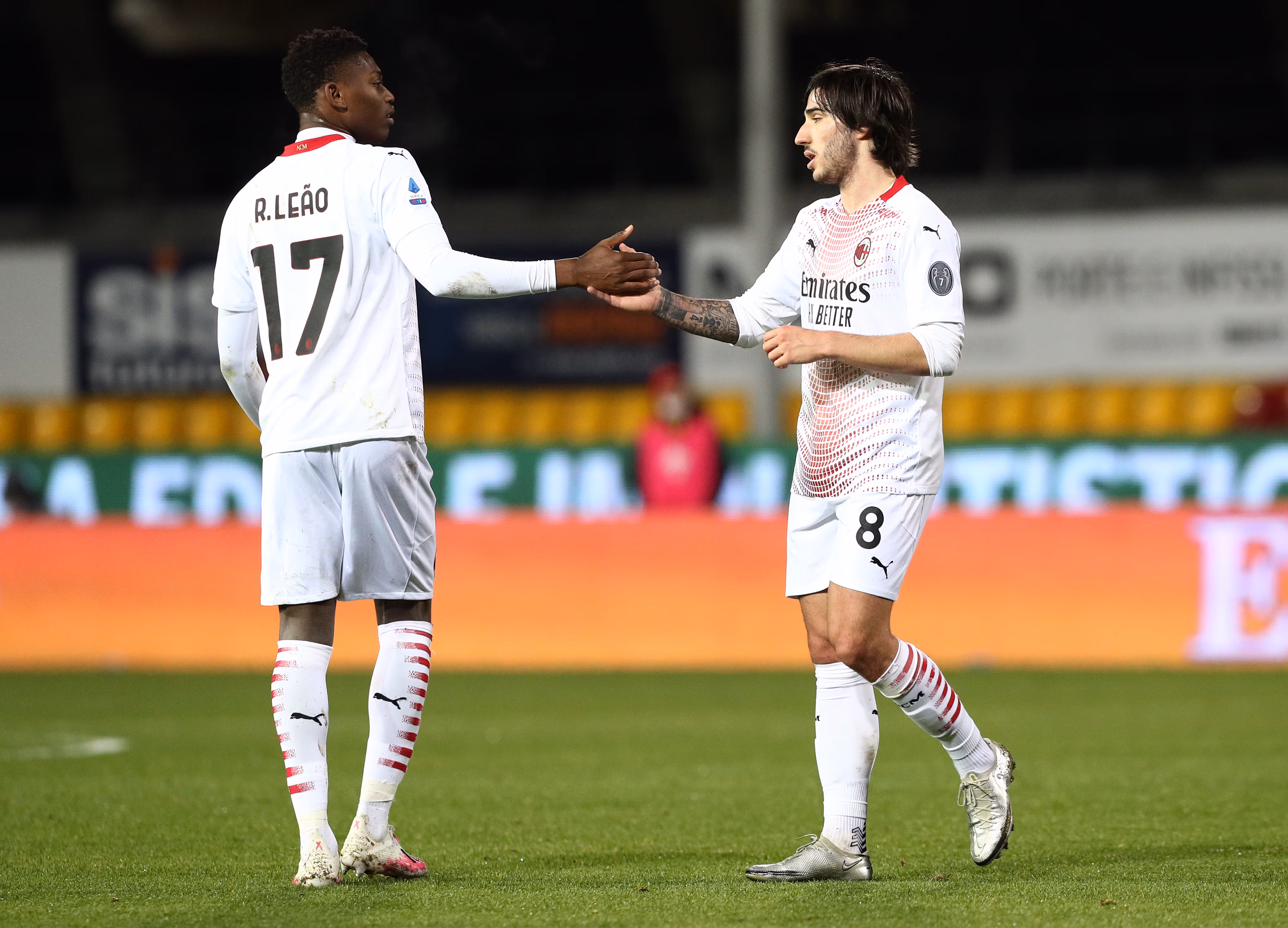Rafael Leao dà il cinque al compagno Sandro Tonali durante Benevento-Milan