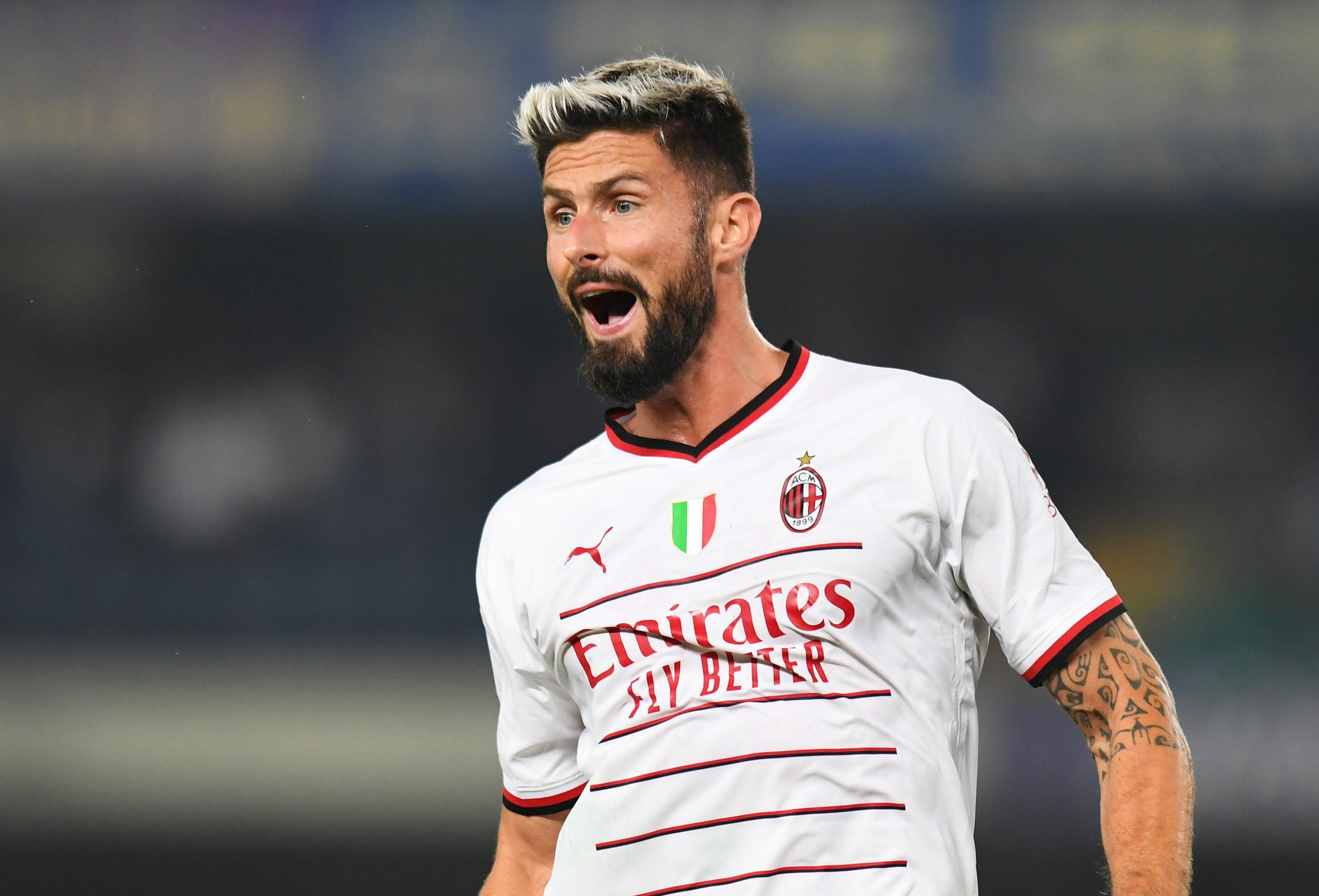 VERONA, ITALY - OCTOBER 16: Olivier Giroud of AC Milan reacts during the Serie A match between Hellas Verona and AC MIlan at Stadio Marcantonio Bentegodi on October 16, 2022 in Verona, Italy. (Photo by Alessandro Sabattini/Getty Images)