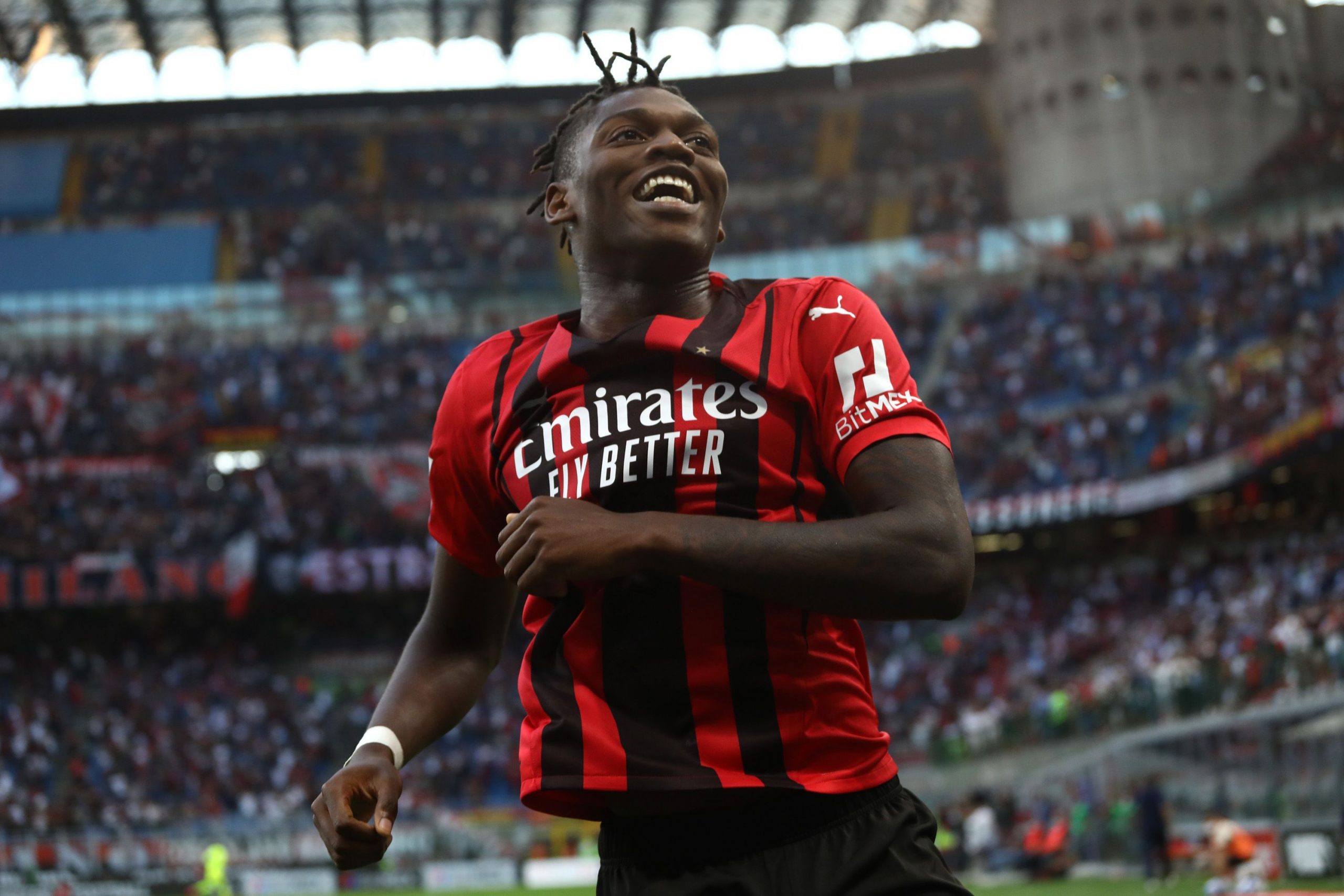 Rafael Leao esulta sotto la curva dopo il gol del vantaggio.
