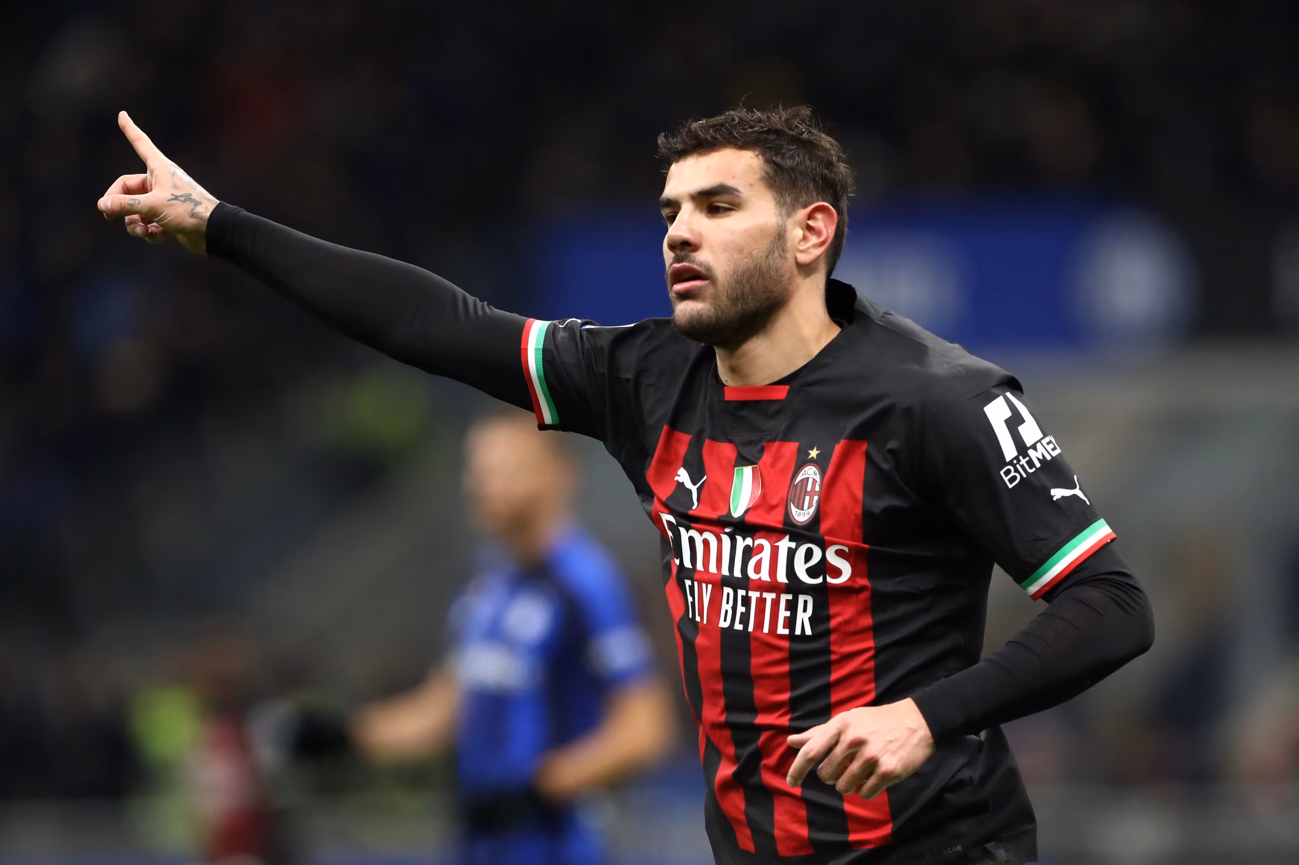 MILAN, ITALY - FEBRUARY 05: Theo Hernandez of AC Milan reacts during the Serie A match between FC Internazionale and AC MIlan at Stadio Giuseppe Meazza on February 05, 2023 in Milan, Italy. (Photo by Marco Luzzani/Getty Images)
