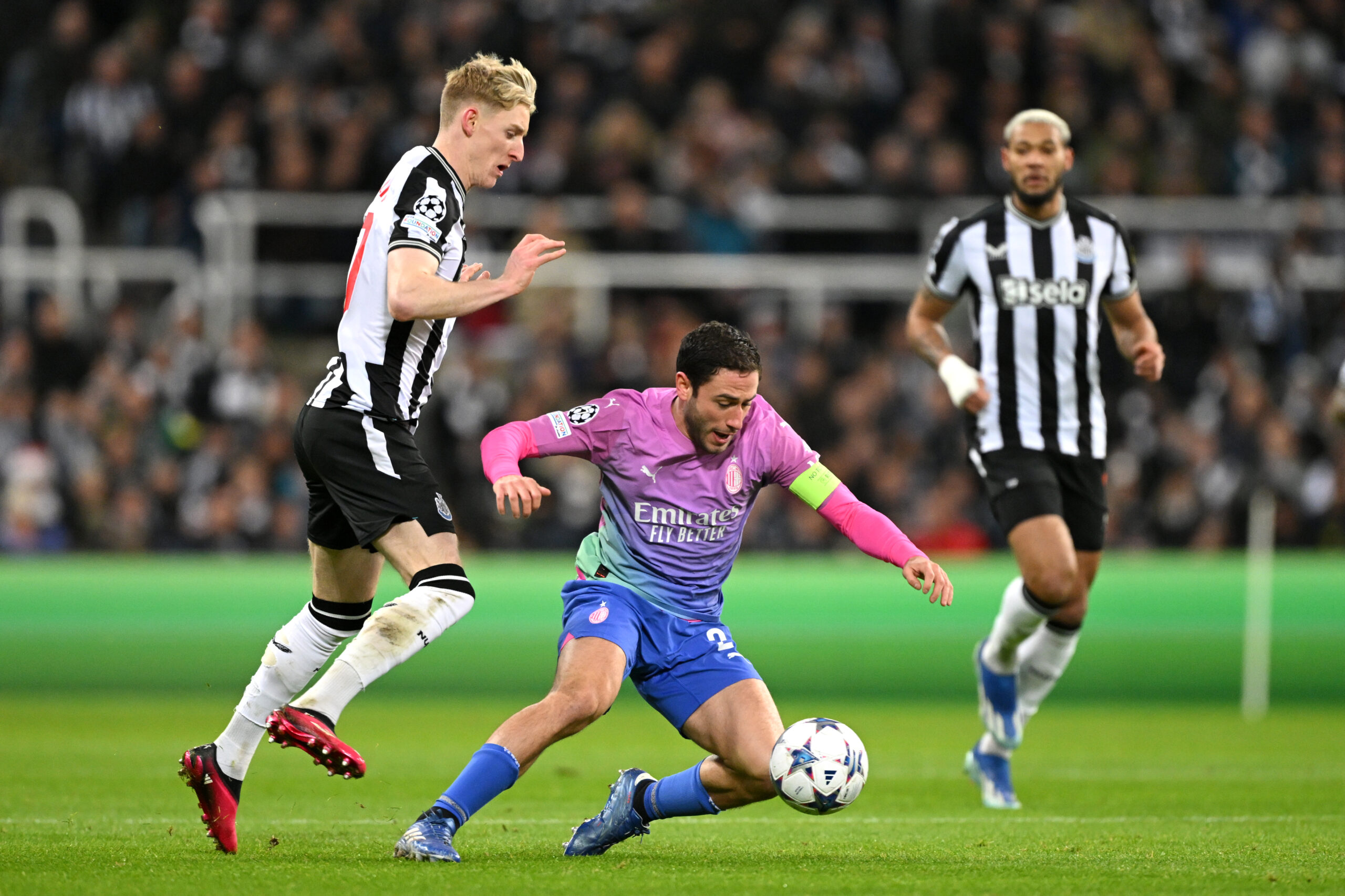 NEWCASTLE UPON TYNE, ENGLAND - DECEMBER 13: Davide Calabria of AC Milan is challenged by Anthony Gordon of Newcastle United during the UEFA Champions League match between Newcastle United FC and AC Milan at St. James Park on December 13, 2023 in Newcastle upon Tyne, England. (Photo by Stu Forster/Getty Images)