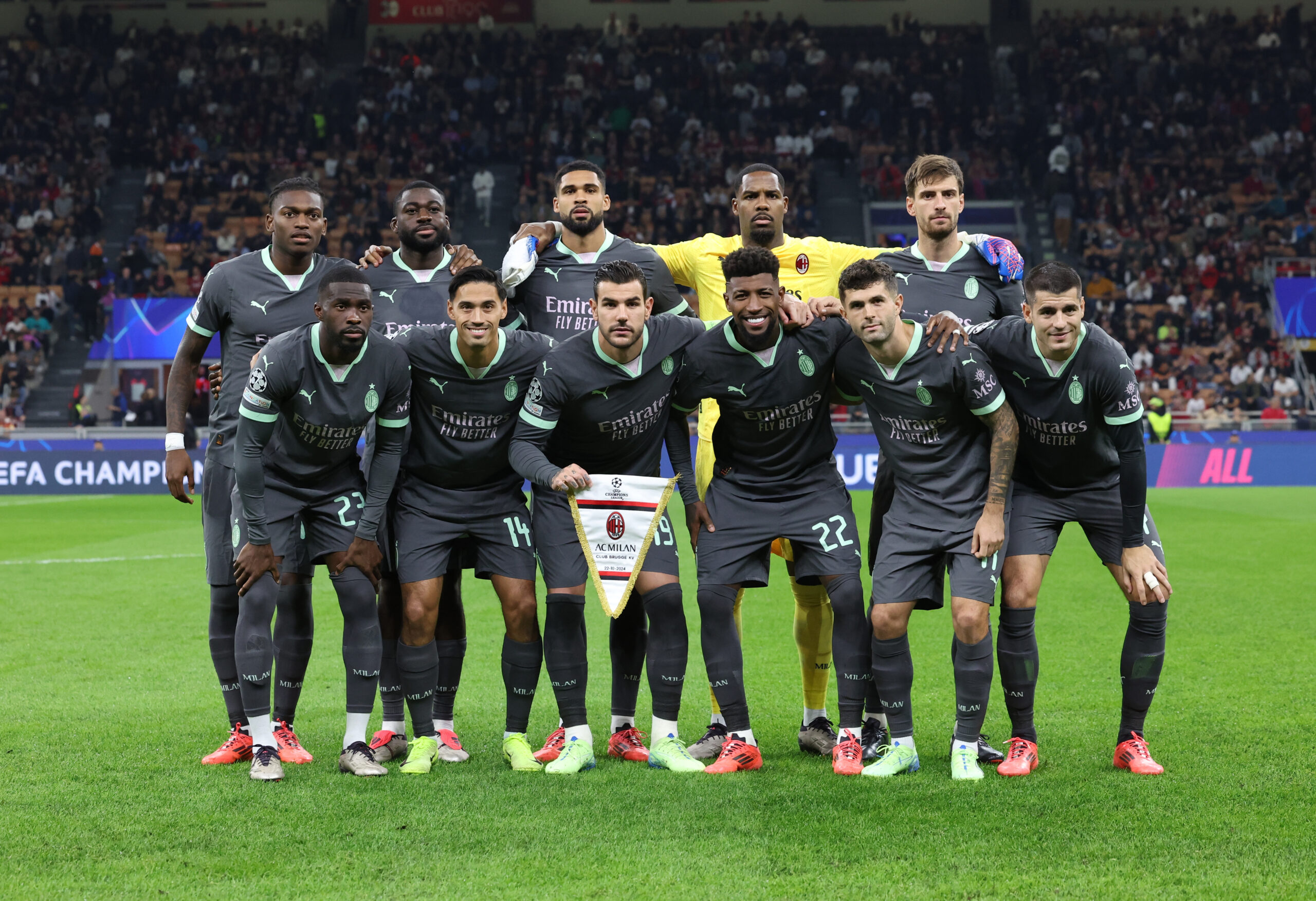 MILAN, ITALY - OCTOBER 22: Players of AC Milan line up prior to the UEFA Champions League 2024/25 League Phase MD3 match between AC Milan and Club Brugge KV at Stadio San Siro on October 22, 2024 in Milan, Italy. (Photo by Claudio Villa/AC Milan via Getty Images)