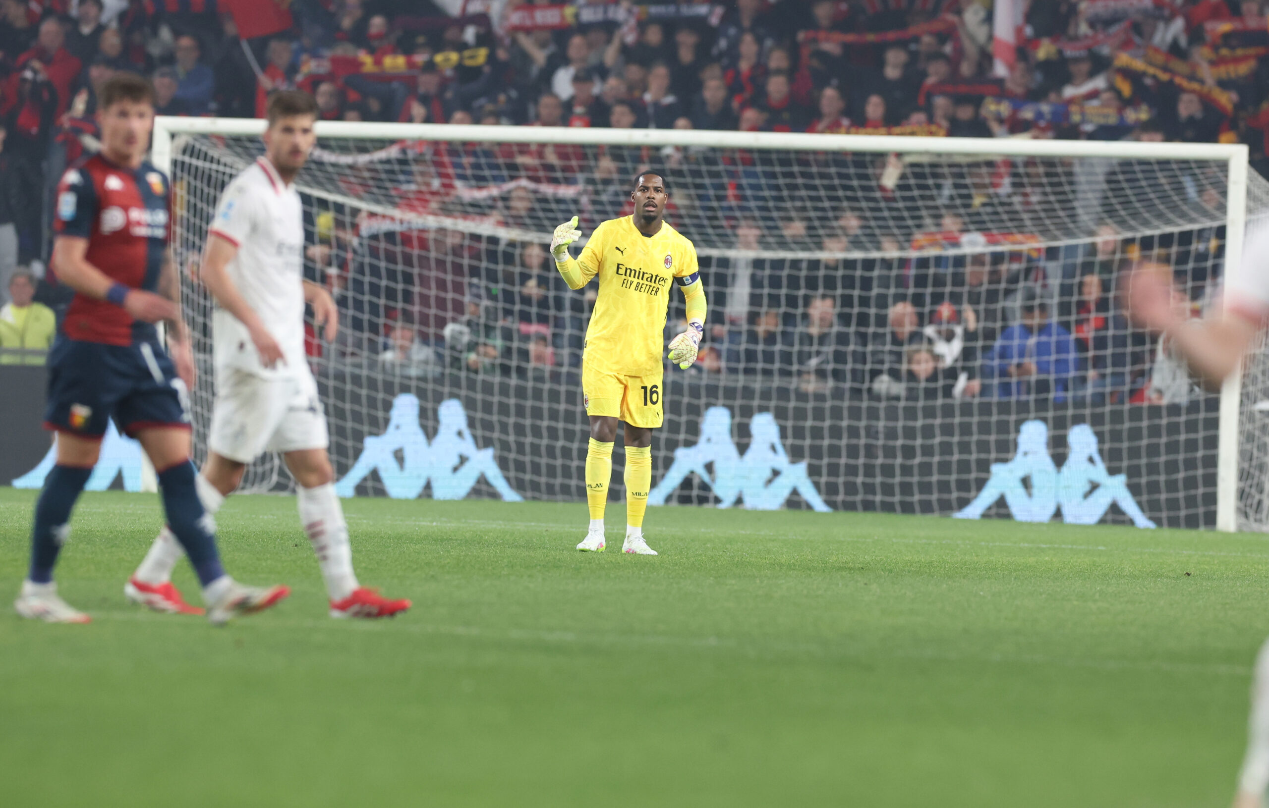 GENOA, ITALY - MAY 05: Mike Maignan of AC Milan in action during the Serie A match between Genoa and AC Milan at Stadio Luigi Ferraris on May 05, 2025 in Genoa, Italy. (Photo by Claudio Villa/AC Milan via Getty Images)