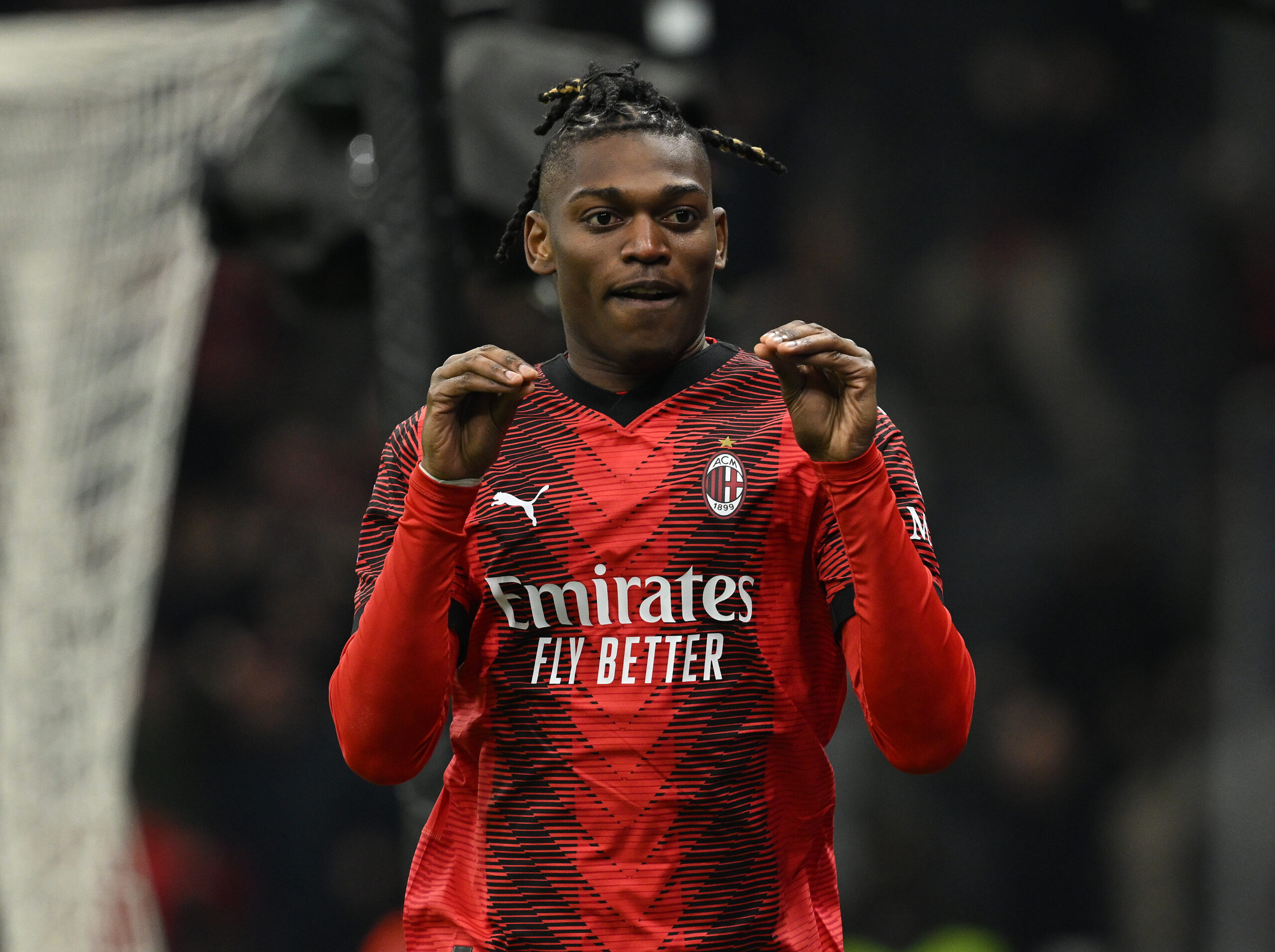 MILAN, ITALY - FEBRUARY 25: Rafael Leao of AC Milan celebrates after scoring the goal during the Serie A TIM match between AC Milan and Atalanta BC at Stadio Giuseppe Meazza on February 25, 2024 in Milan, Italy. (Photo by Claudio Villa/AC Milan via Getty Images)