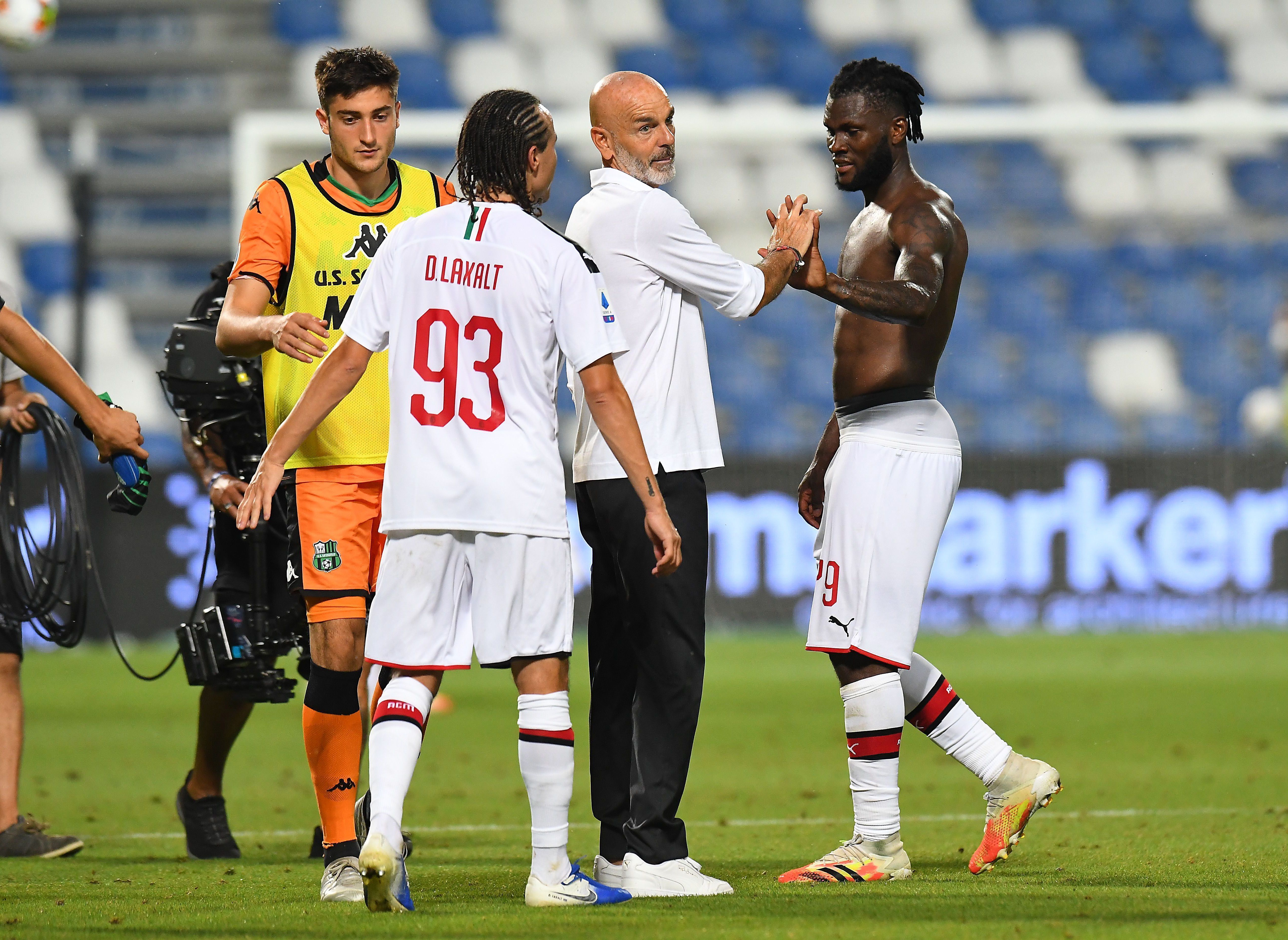REGGIO NELL'EMILIA, ITALY - JULY 21: Stefano Pioli head coach of AC Milan and Frank Kessie of AC Milan celebrate the victory after the Serie A match between US Sassuolo and AC Milan at Mapei Stadium - Città del Tricolore on July 21, 2020 in Reggio nell'Emilia, Italy. (Photo by Alessandro Sabattini/Getty Images)