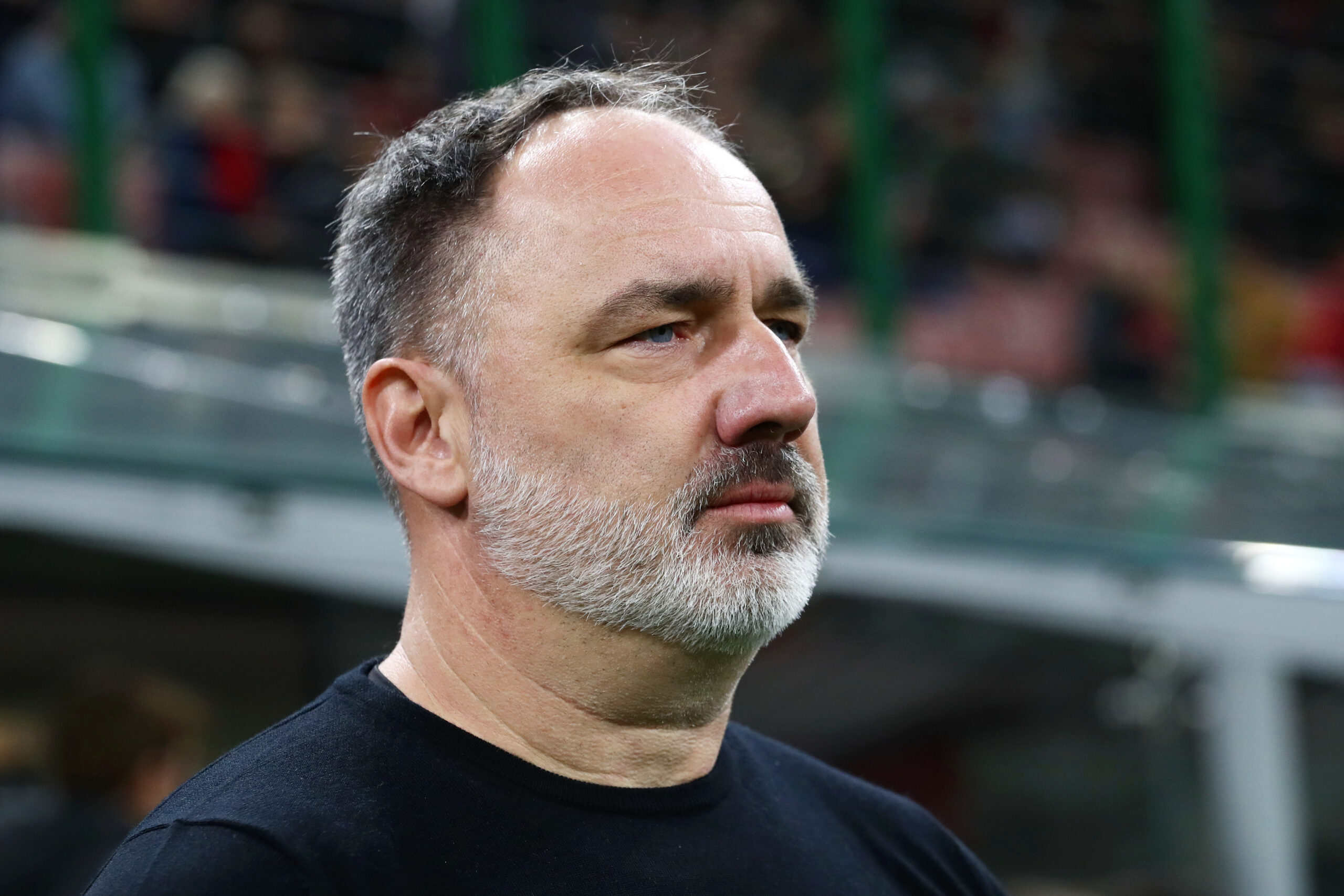 MILAN, ITALY - MARCH 07: Jindrich Trpisovsky, Head Coach of Slavia Prague, looks on prior to the UEFA Europa League 2023/24 round of 16 first leg match between AC Milan and Slavia Praha at Stadio Giuseppe Meazza on March 07, 2024 in Milan, Italy. (Photo by Marco Luzzani/Getty Images) (Photo by Marco Luzzani/Getty Images)