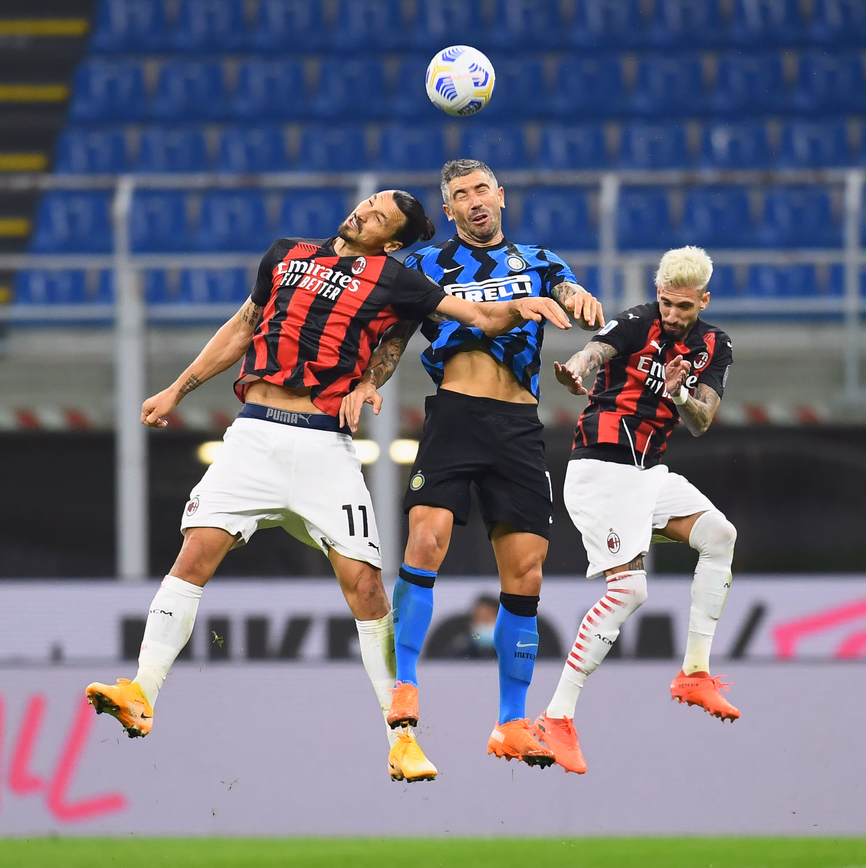MILAN, ITALY - OCTOBER 17: Aleksandar Kolarov of FC Internazionale competes for the ball with Zlatan Ibrahimovic of AC Milan during the Serie A match between FC Internazionale and AC Milan at Stadio Giuseppe Meazza on October 17, 2020 in Milan, Italy. (Photo by Claudio Villa - Inter/Inter via Getty Images)