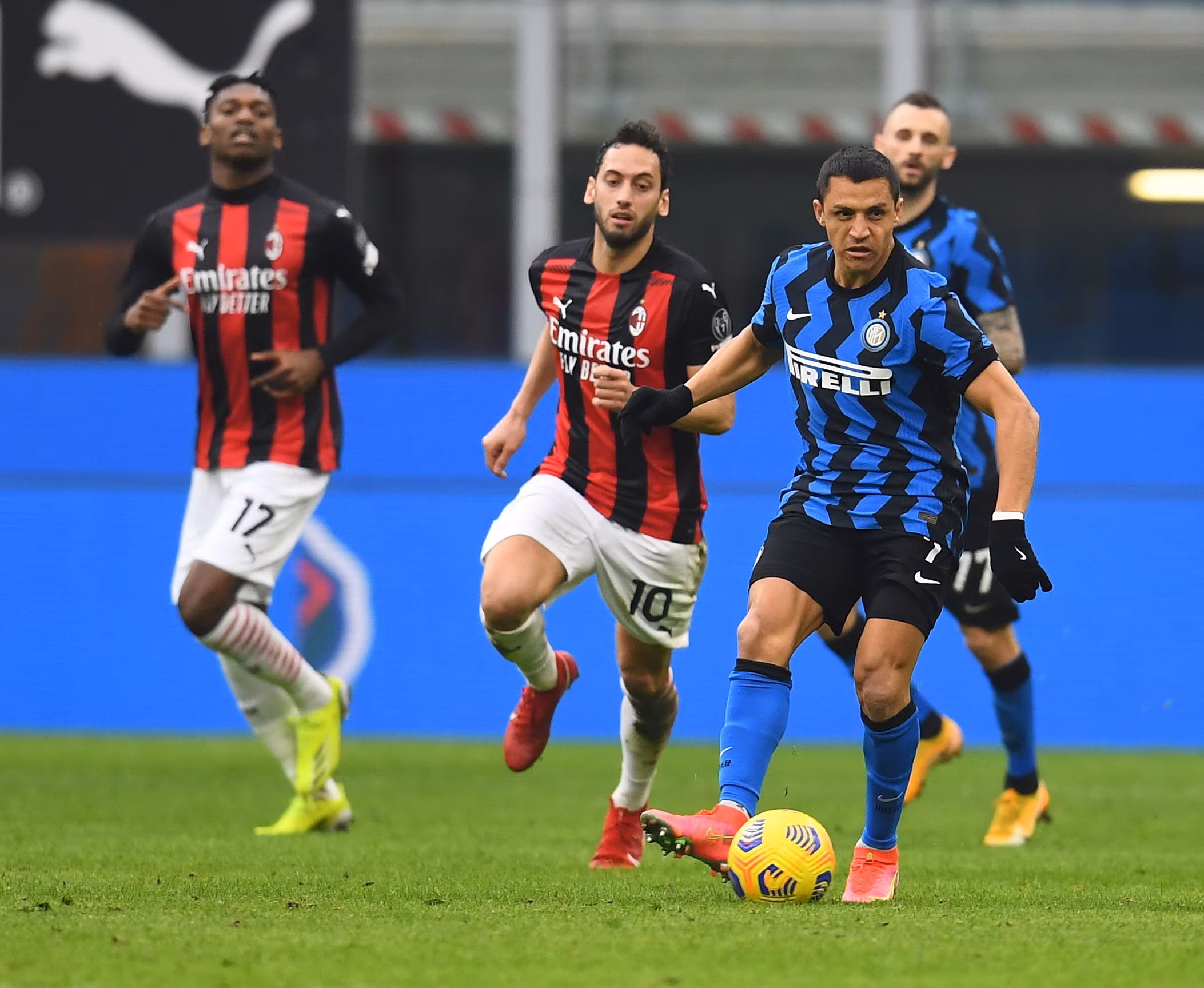 Alexis Sanchez dell'Inter inseguito da Calhanoglu del Milan