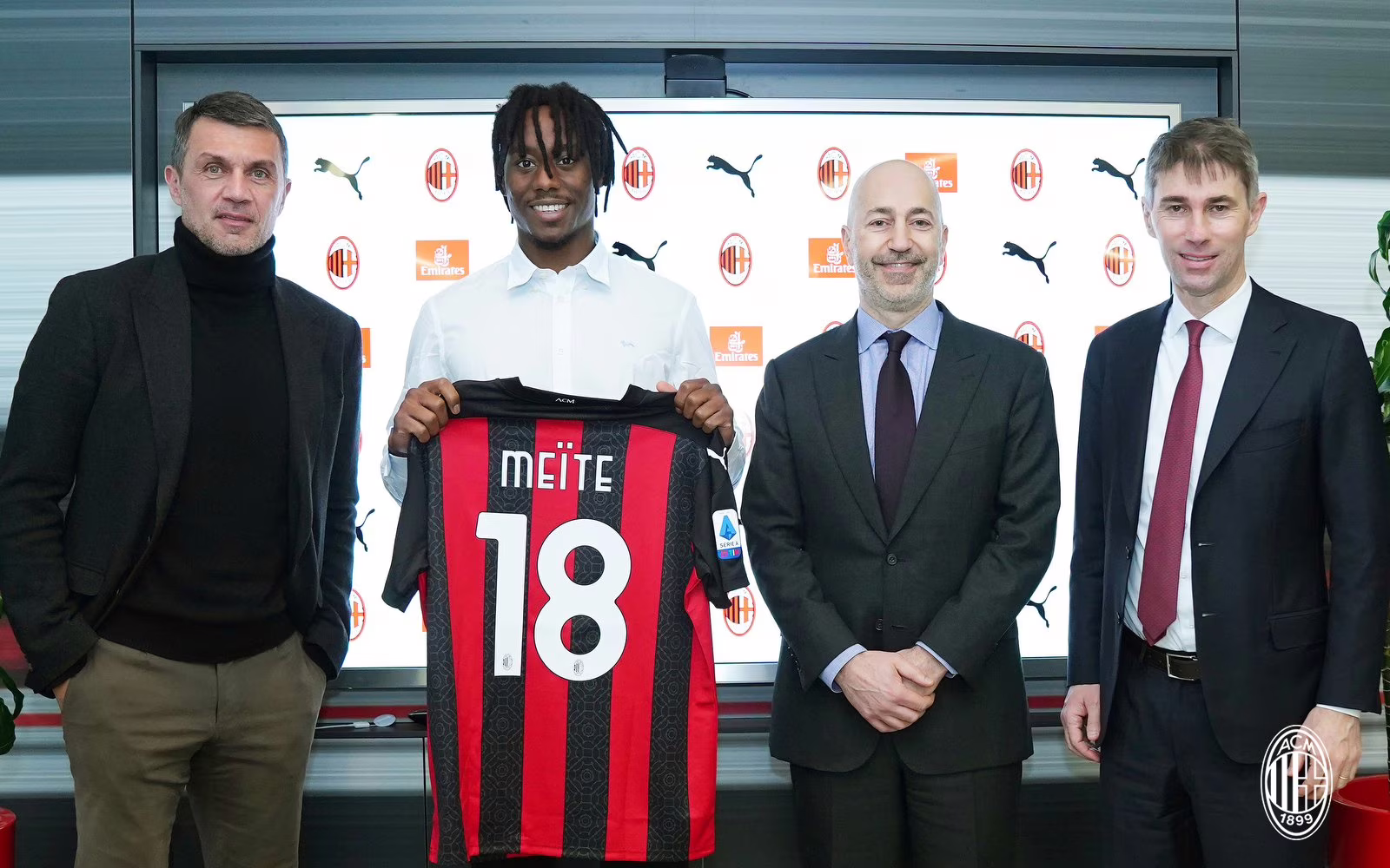 Meité posa con la maglia del Milan assieme a Maldini, Gazidis e Massara