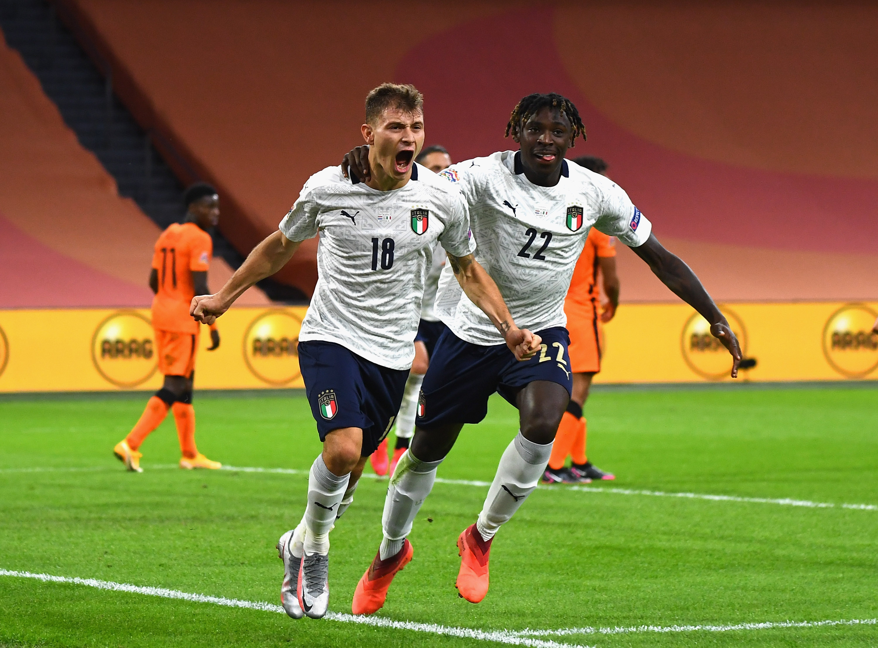 AMSTERDAM, NETHERLANDS - SEPTEMBER 07: Nicolo Barella of Italy celebrates with Moise Kean after scoring the opening goal during the UEFA Nations League group stage match between Netherlands and Italy at Johan Cruijff Arena on September 7, 2020 in Amsterdam, Netherlands. (Photo by Claudio Villa/Getty Images)
