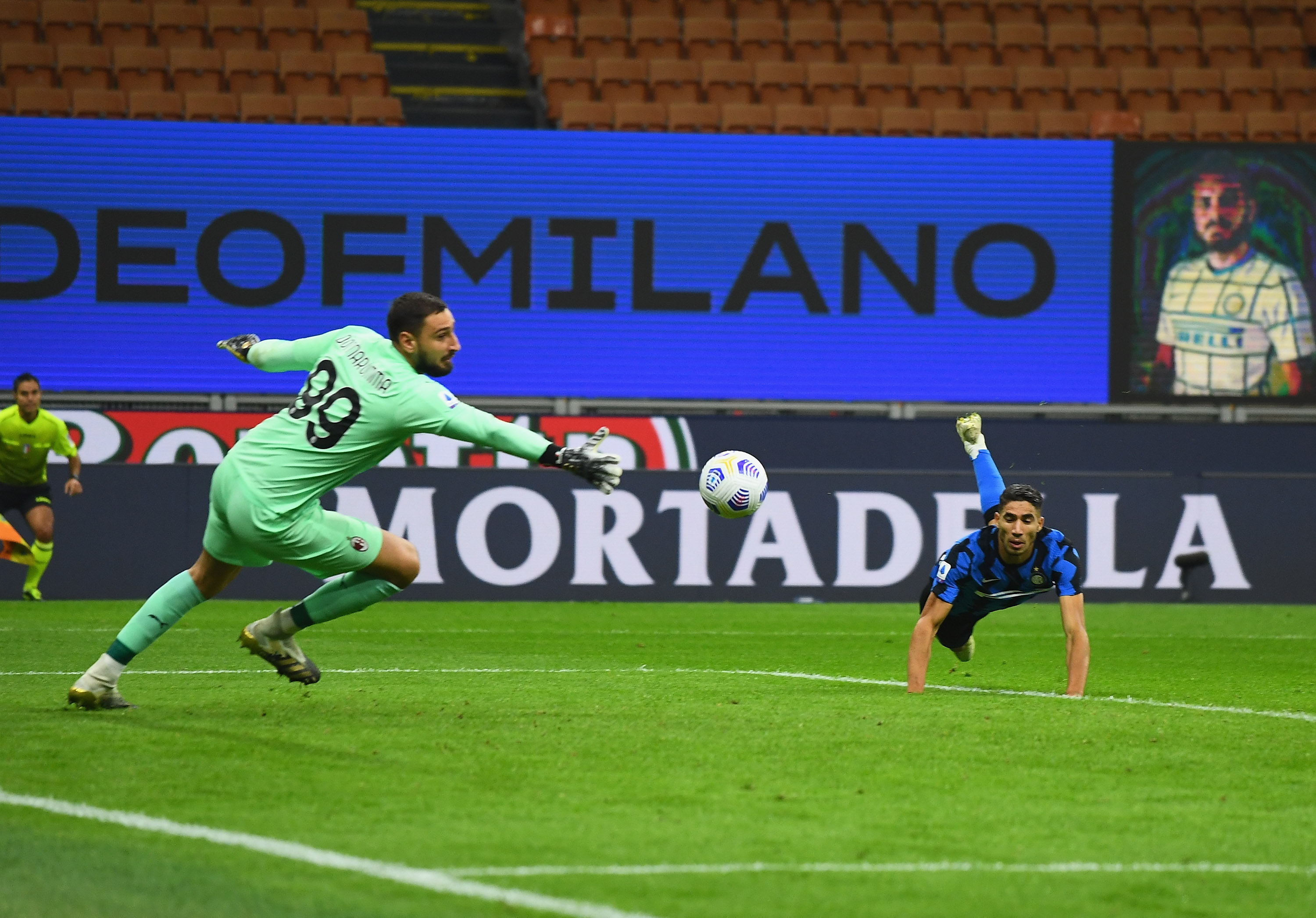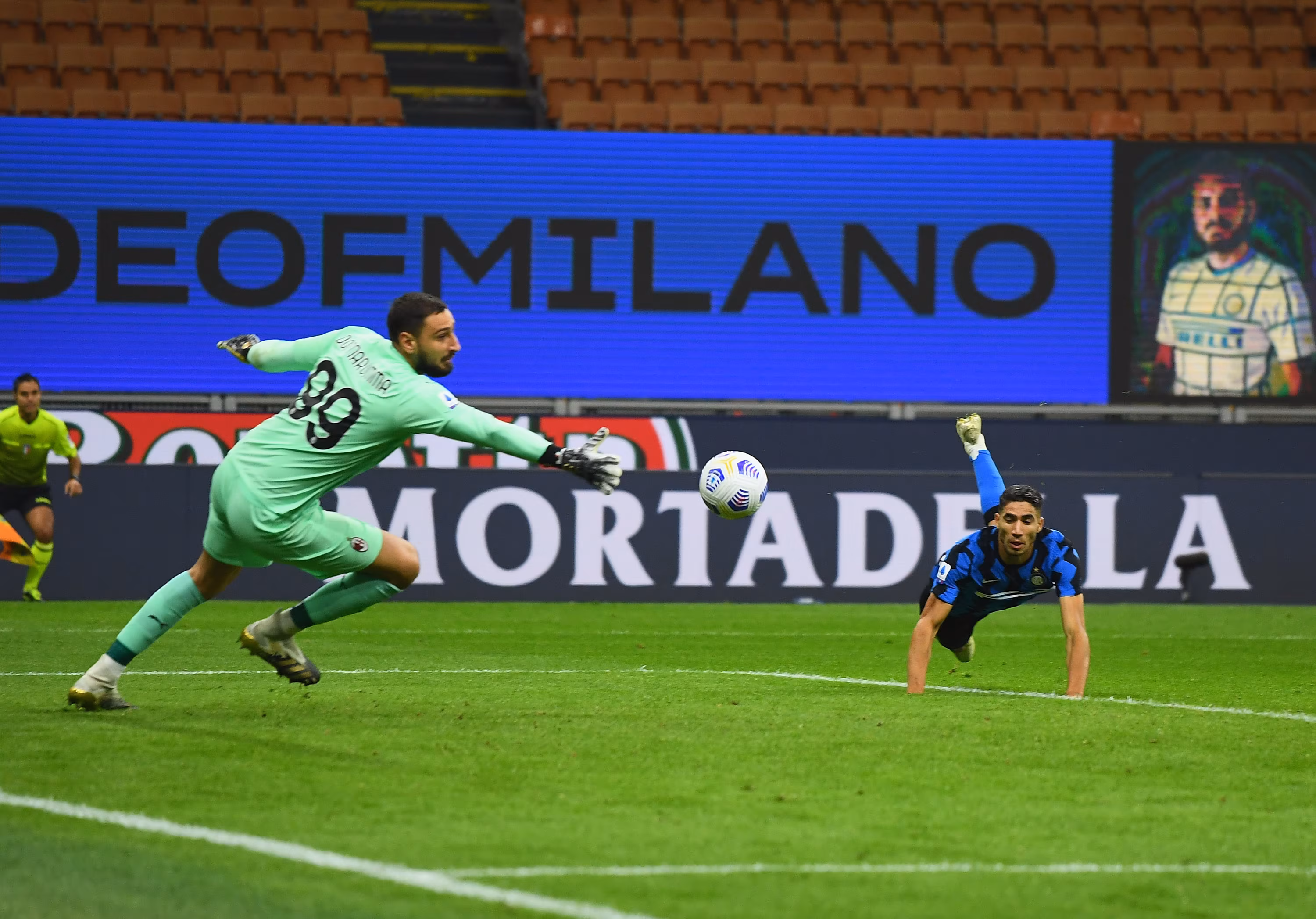 Gigio Donnarumma interviene sul colpo di testa di Hakimi nel derby d'andata